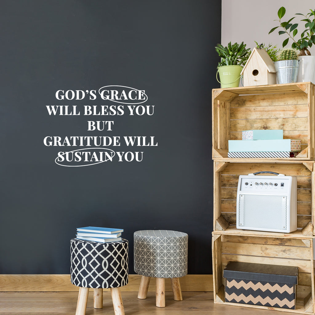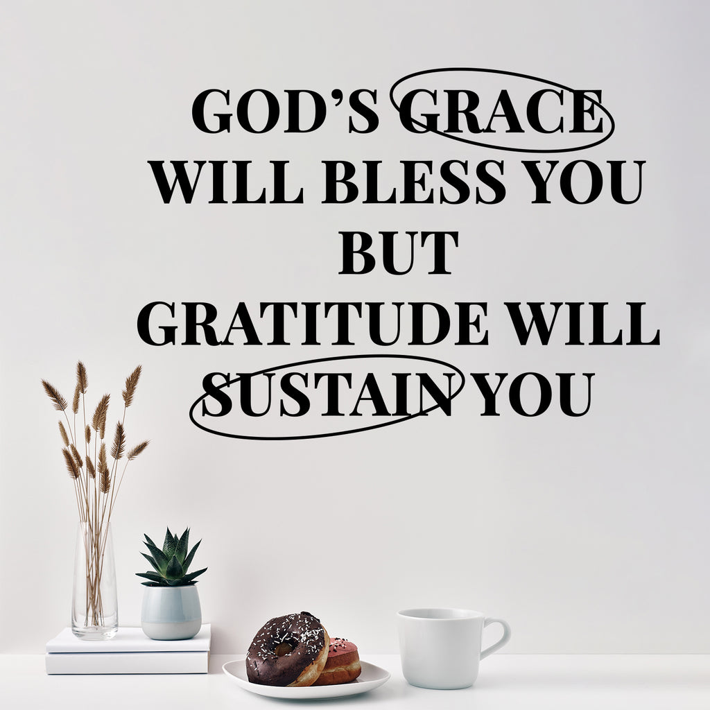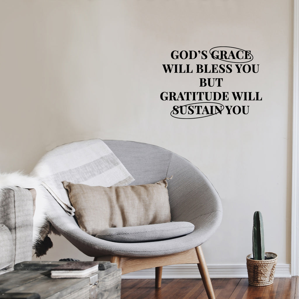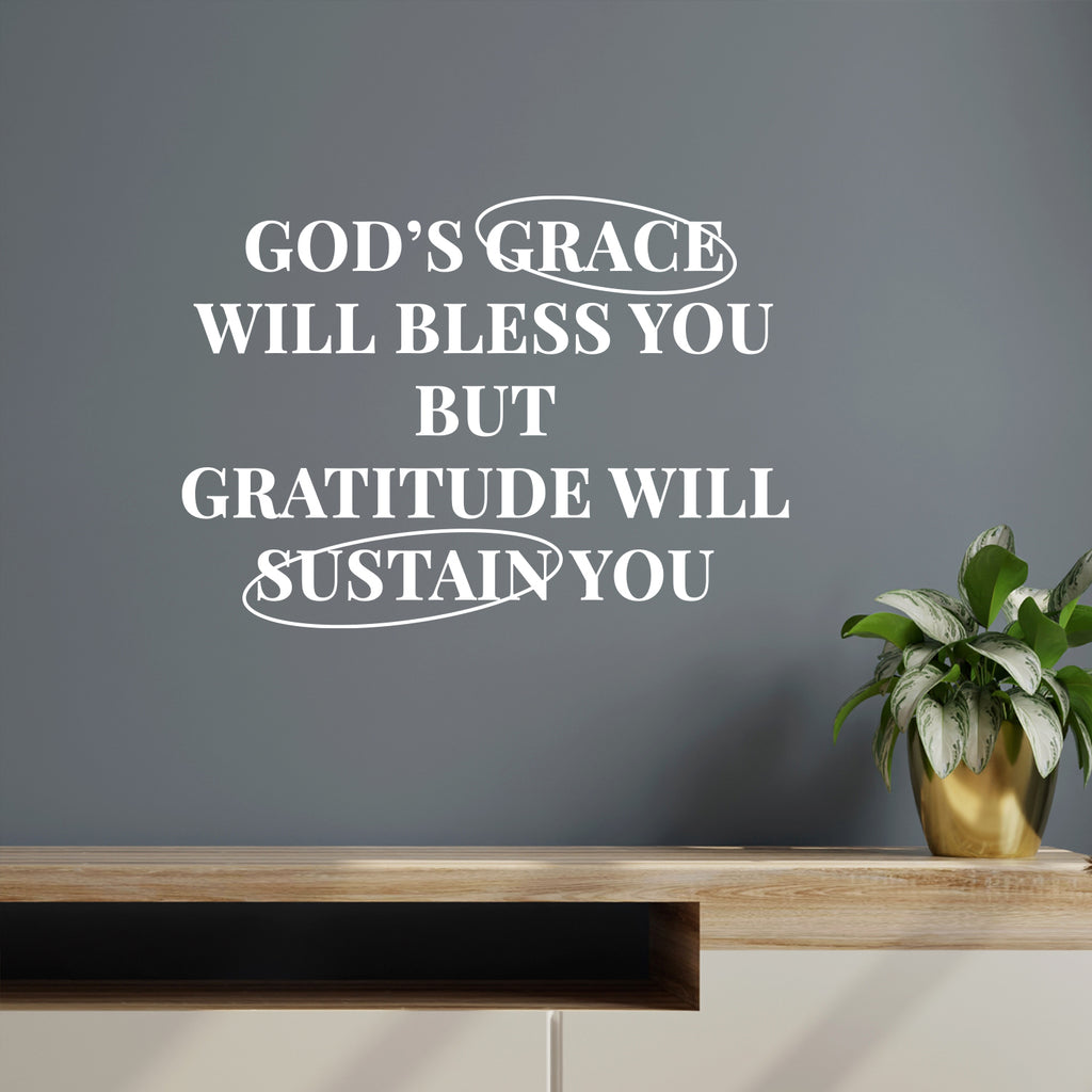 This decal quote "God's Grace Will Bless You But Gratitude Will Sustain You"; is the perfect touch for your home or work. Use it for your dorm room; home office or anywhere you want to bring some extra decoration. It's a vinyl sticker that is easy to put on any smooth and dry surface. Our modern designs don't just brighten up the room; but brighten up the day. Using top of the line vinyl across all of our production allows us to be the leaders in quality and design.