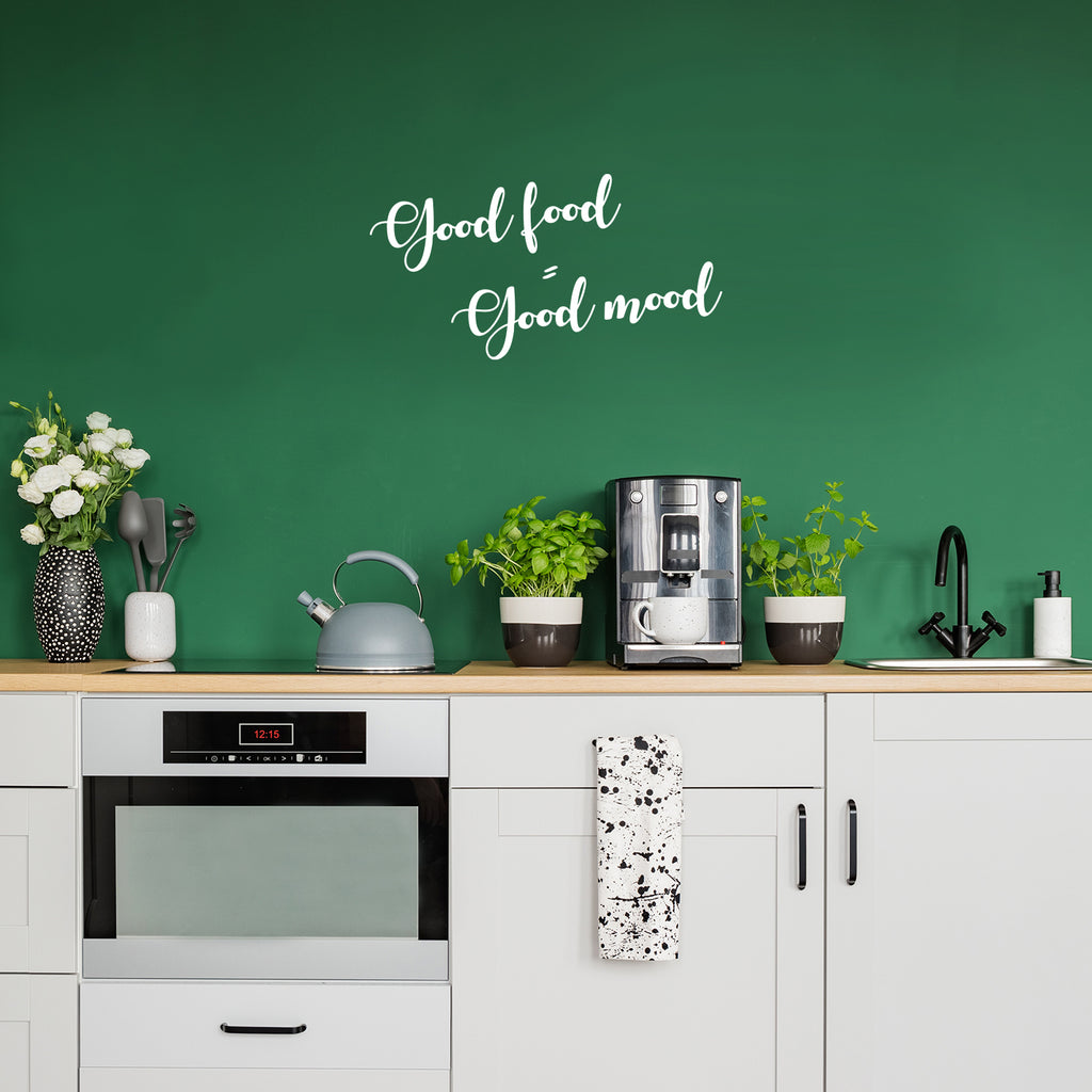 This awesome funny decal quote "Good Food = Good Mood"; is the perfect touch for your home. Use it for your dining room; restaurant; kitchen or anywhere you want to bring some extra decoration. It's a vinyl sticker that is easy to put on any smooth and dry surface. Our modern designs don't just brighten up the room; but brighten up the day. Using top of the line vinyl across all of our production allows us to be the leaders in quality and design.