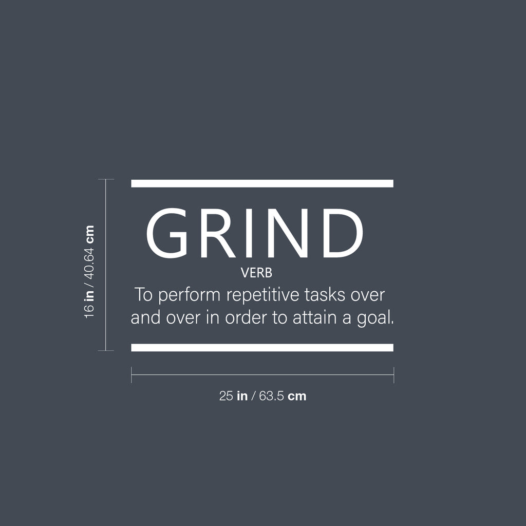 This awesome motivational decal quote "Grind. To Perform Repetitive Task Over And Over In Order To Attain A Goal"; is the perfect touch for your home or school. Use it for your living room; playroom; kids room or anywhere you want to bring some extra cute decoration. It's a vinyl sticker that is easy to put on any smooth and dry surface. Our modern designs don't just brighten up the room; but brighten up the day. Using top of the line vinyl across all of our production allows us to be the leaders in quality and design.