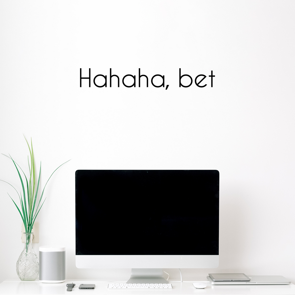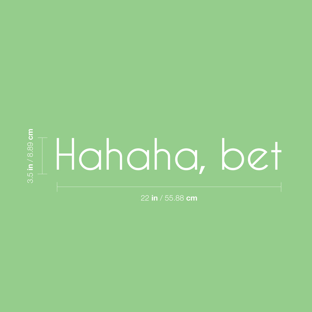 This awesome funny & sarcastic decal quote "Hahaha; Bet"; is the perfect touch for your home or office. Use it for your business; coffee shop; bathroom or anywhere you want to bring some extra inspirational decoration. It's a vinyl sticker that is easy to put on any smooth and dry surface. Our modern designs don't just brighten up the room; but brighten up the day. Using top of the line vinyl across all of our production allows us to be the leaders in quality and design.