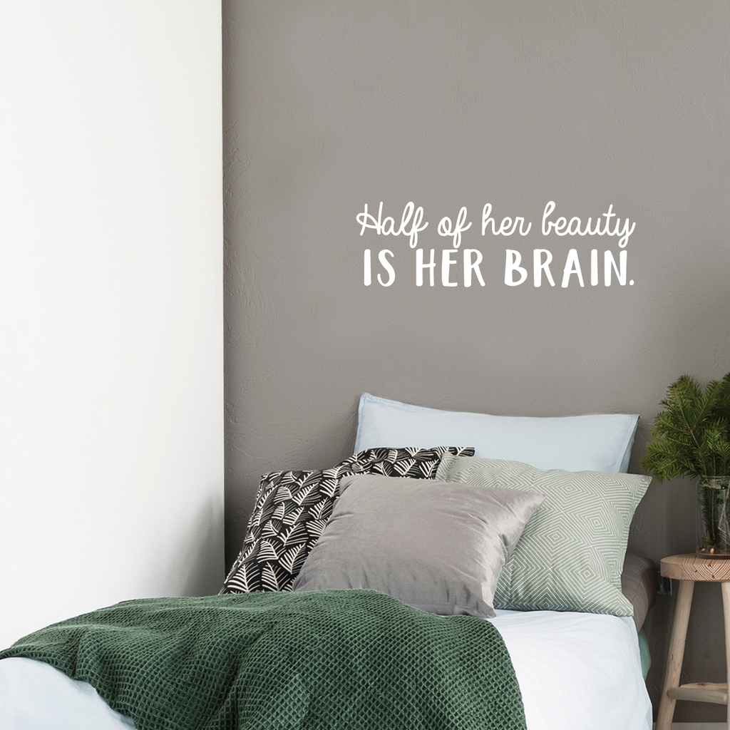 This awesome motivational decal quote "Half Of Her Beauty Is Her Brain "; is the perfect touch for your home. Use it for your bedroom; living room; office or anywhere you want to bring some extra decoration. It's a vinyl sticker that is easy to put on any smooth and dry surface. Our modern designs don't just brighten up the room; but brighten up the day. Using top of the line vinyl across all of our production allows us to be the leaders in quality and design.