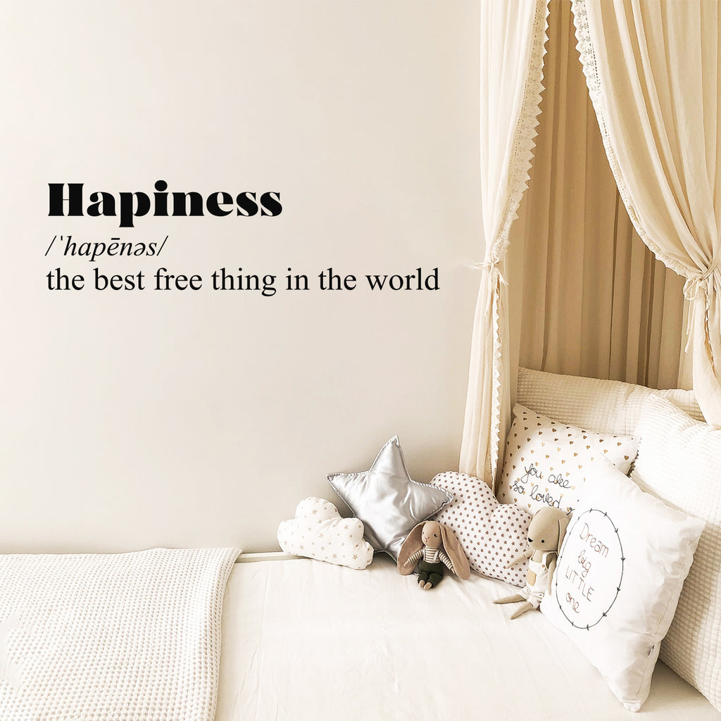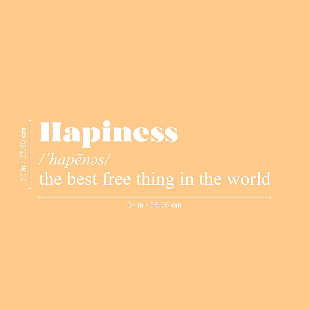 This great decal quote "Happiness: The Best Free Thing In The World"; is the perfect touch for your home. Use it for your kids room; living room or anywhere you want to bring some extra decoration. It's a vinyl sticker that is easy to put on any smooth and dry surface. Our modern designs don't just brighten up the room; but brighten up the day. Using top of the line vinyl across all of our production allows us to be the leaders in quality and design.