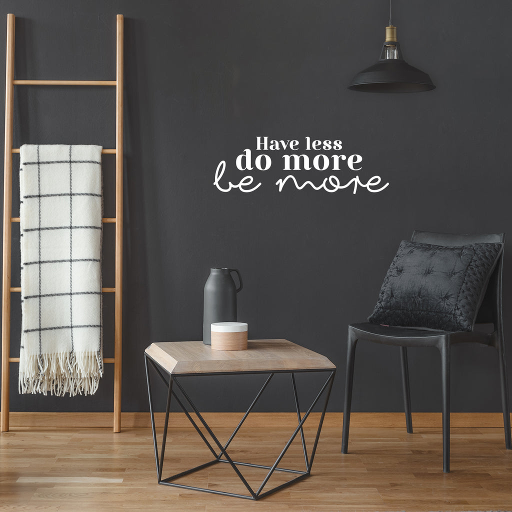 This awesome fun decal quote "Have Less Do more Be more"; is the perfect touch for your home or school. Use it for your living room; playroom; office or anywhere you want to bring some extra cute decoration. It's a vinyl sticker that is easy to put on any smooth and dry surface. Our modern designs don't just brighten up the room; but brighten up the day. Using top of the line vinyl across all of our production allows us to be the leaders in quality and design.