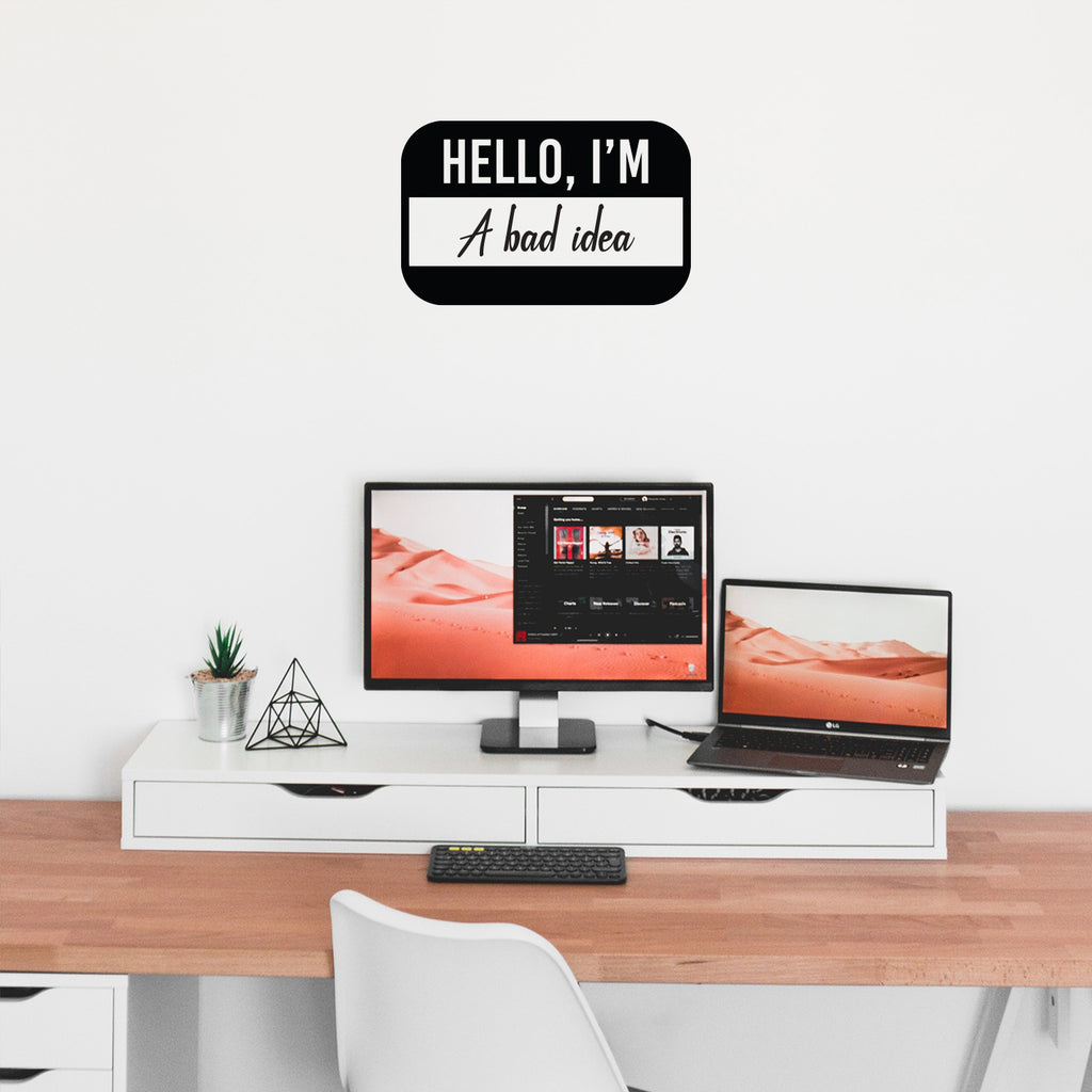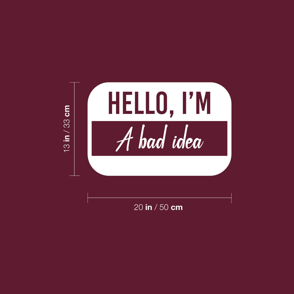 This awesome funny & sarcastic decal quote "Hello My Name Is A Bad Idea"; is the perfect touch for your home or office. Use it for your storefront; coffee shop or anywhere you want to bring some extra funny decoration. It's a vinyl sticker that is easy to put on any smooth and dry surface. Our modern designs don't just brighten up the room; but brighten up the day. Using top of the line vinyl across all of our production allows us to be the leaders in quality and design.