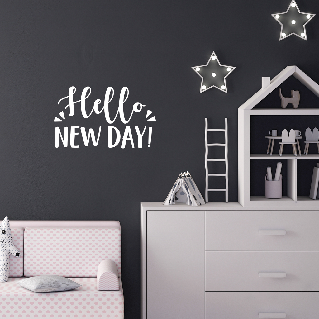 This awesome decal quote "Hello New Day"; is the perfect touch for your home. Use it for your bedroom; living room; office or anywhere you want to bring some extra decoration. It's a vinyl sticker that is easy to put on any smooth and dry surface. Our modern designs don't just brighten up the room; but brighten up the day. Using top of the line vinyl across all of our production allows us to be the leaders in quality and design.