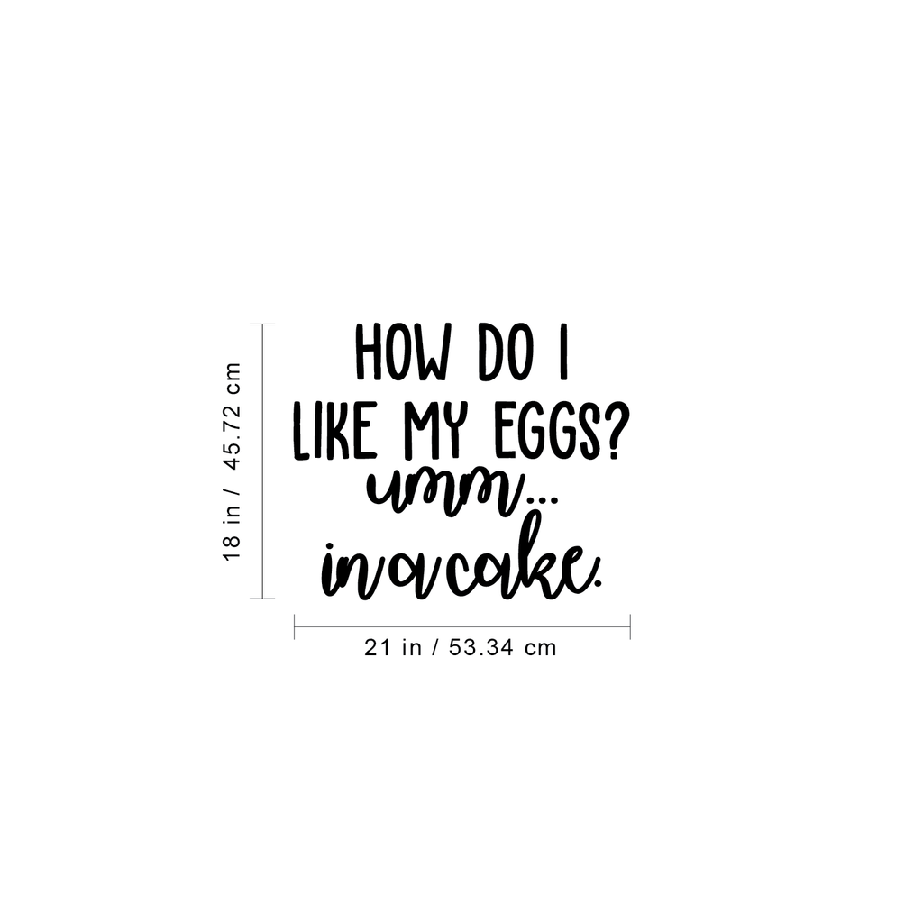 This funny "How Do I Like My Eggs? In A Cake" wall decal quote is modern and the perfect touch for your home or restaurant. Use it for your kitchen; bar; or any other room in your house where you want to bring some extra decoration. It's a vinyl sticker that is easy to put on almost any smooth and dry surface. Our designs don't just brighten up the room; but brighten up your day. Using top of the line vinyl across all of our production allows us to be the leaders in quality and design.