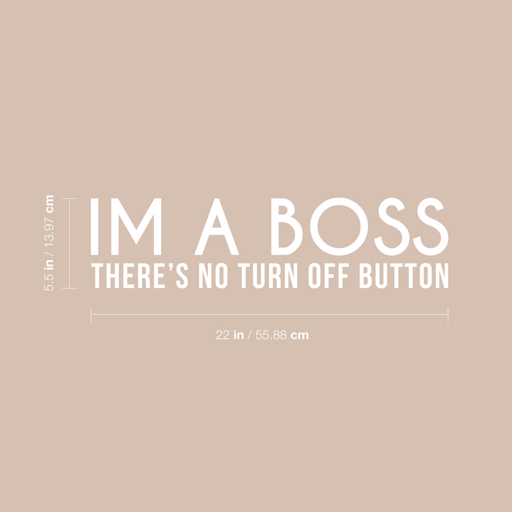 This awesome optimistic & motivational decal quote "I Am A Boss There's No Turn Off Button"; is the perfect touch for your gym or office. Use it for your living room; school; workout space or anywhere you want to bring some extra positive decoration. It's a vinyl sticker that is easy to put on any smooth and dry surface. Our modern designs don't just brighten up the room; but brighten up the day. Using top of the line vinyl across all of our production allows us to be the leaders in quality and design.
