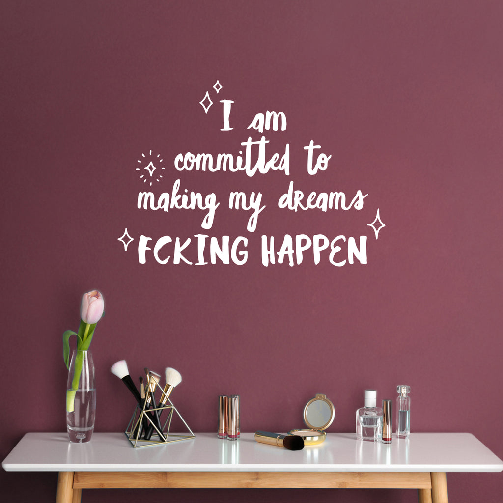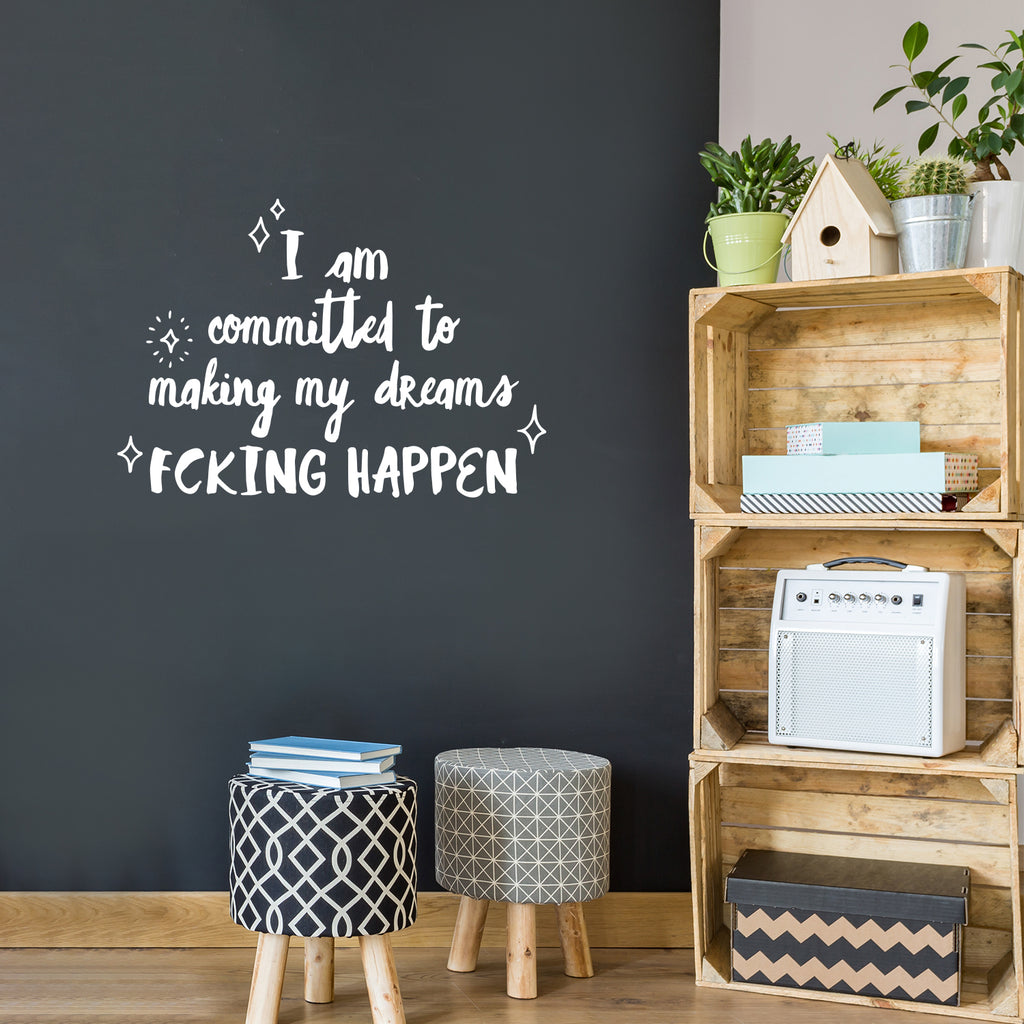 This awesome positive decal quote "I Am Committed To Making My Dreams Fcking Happen"; is the perfect touch for your home or office. Use it for your school; bedroom; coffee shop or anywhere you want to bring some extra positive decoration. It's a vinyl sticker that is easy to put on any smooth and dry surface. Our modern designs don't just brighten up the room; but brighten up the day. Using top of the line vinyl across all of our production allows us to be the leaders in quality and design.