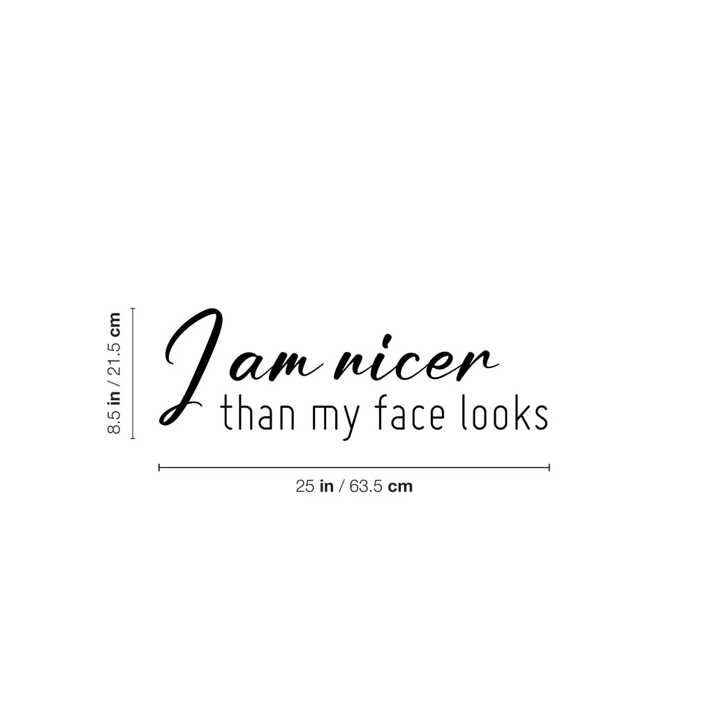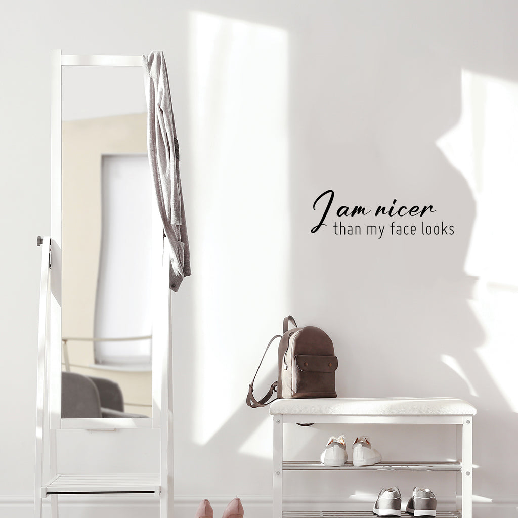 This decal quote "I Am Nicer Than My Face Looks"; is the perfect touch for your home or office. Use it for your living room; boutique; beauty saloon or anywhere you want to bring some extra positive decoration. It's a vinyl sticker that is easy to put on any smooth and dry surface. Our modern designs don't just brighten up the room; but brighten up the day. Using top of the line vinyl across all of our production allows us to be the leaders in quality and design.