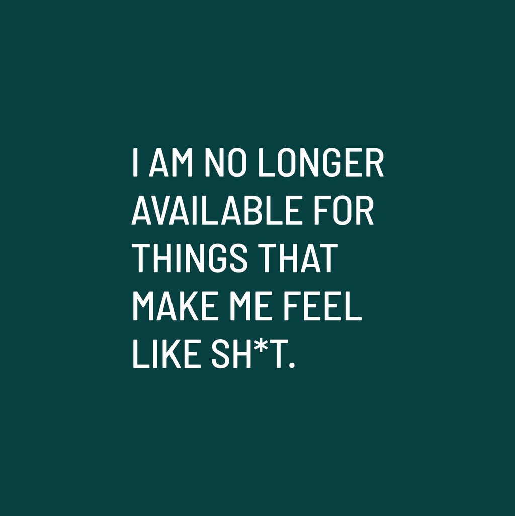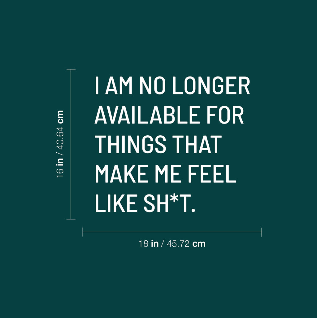This awesome funny decal quote "I Am No Longer Available For Things That Make Me Feel Like Sh!t"; is the perfect touch for your home or office. Use it for your living room; coffee shop or anywhere you want to bring some extra fun decoration. It's a vinyl sticker that is easy to put on any smooth and dry surface. Our modern designs don't just brighten up the room; but brighten up the day. Using top of the line vinyl across all of our production allows us to be the leaders in quality and design.