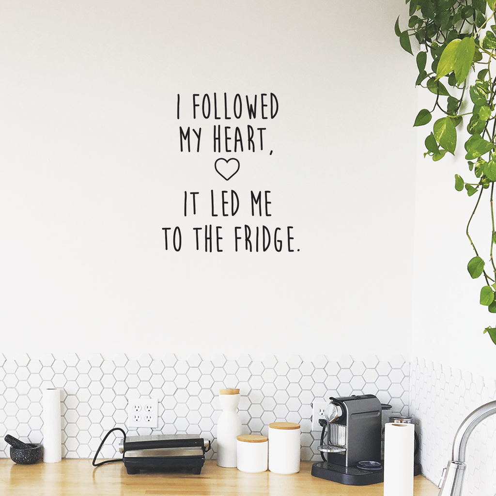 This awesome funny decal quote "I Followed My Heart It Led Me To The Fridge"; is the perfect touch for your living room or coffee shop. Use it for your kitchen; dining room; office or anywhere you want to bring some extra decoration. It's a vinyl sticker that is easy to put on any smooth and dry surface. Our modern designs don't just brighten up the room; but brighten up the day. Using top of the line vinyl across all of our production allows us to be the leaders in quality and design.
