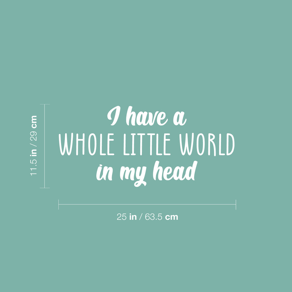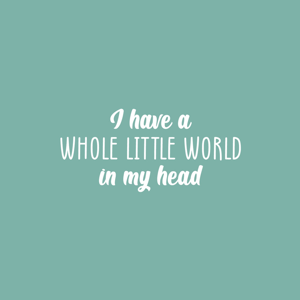 This awesome funny decal quote "I Have A Whole Little World In My Head" is the perfect touch for your home or school. Use it for your nursery; playroom; kids room or anywhere you want to bring some extra cute decoration. It's a vinyl sticker that is easy to put on any smooth and dry surface. Our modern designs don't just brighten up the room; but brighten up the day. Using top of the line vinyl across all of our production allows us to be the leaders in quality and design.