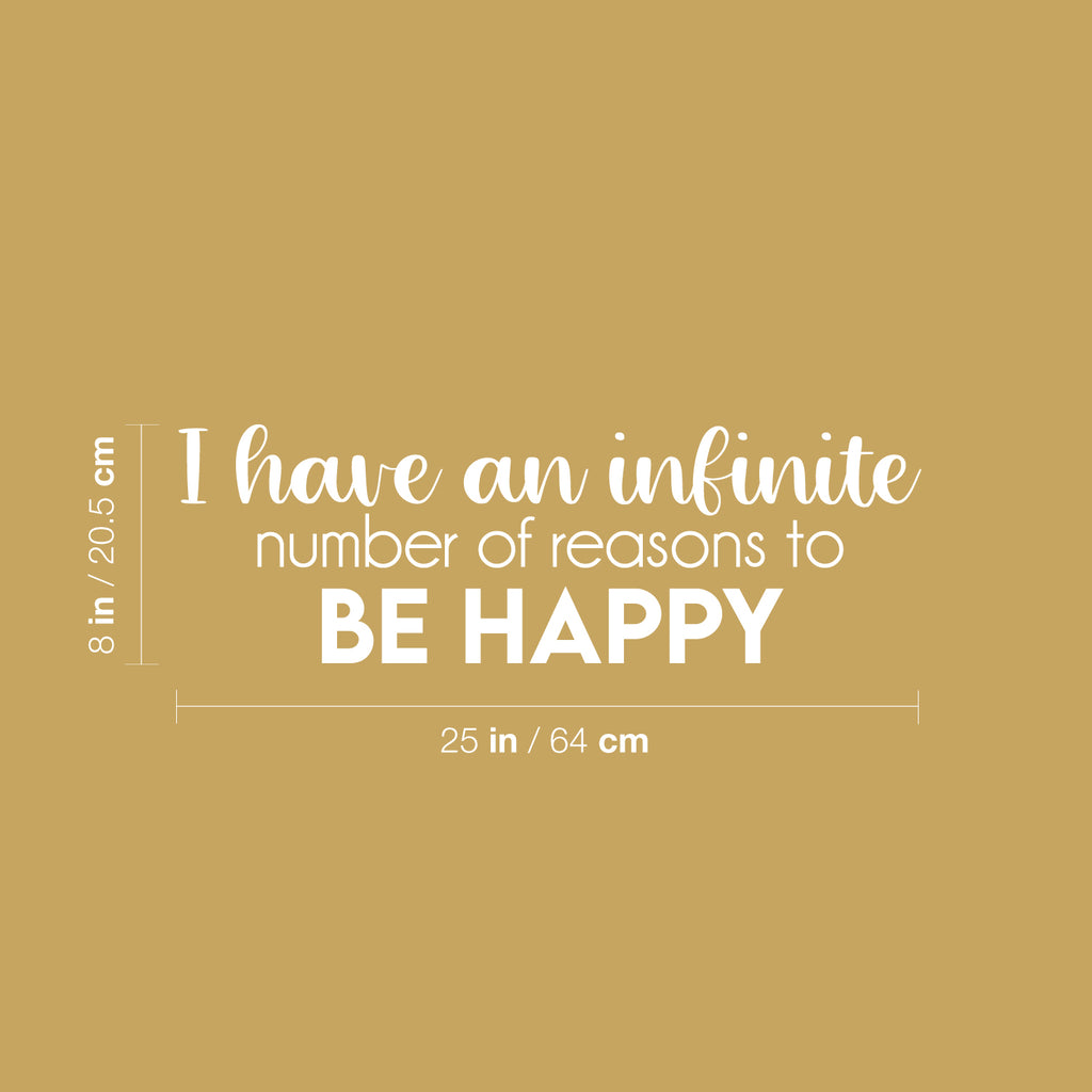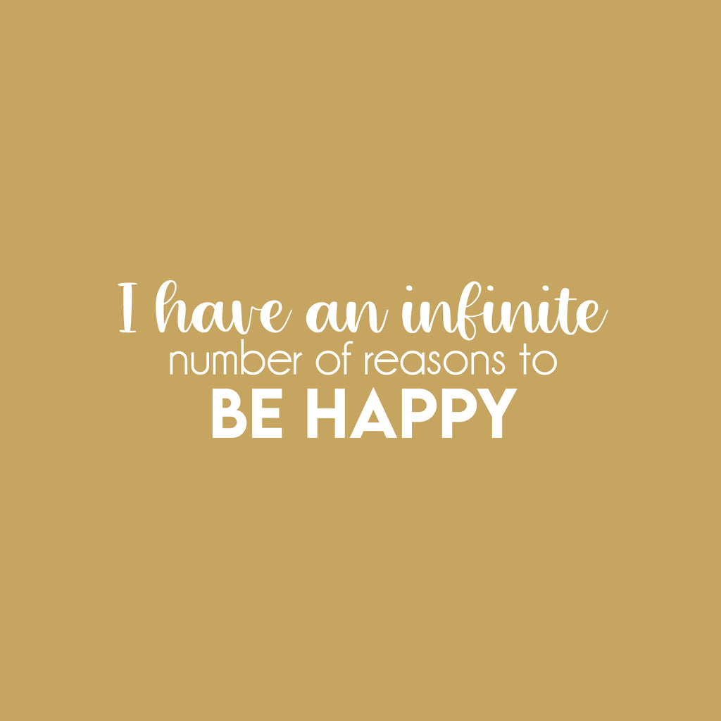 This great decal quote "I Have An Infinite Number Of Reasons To Be Happy"; is the perfect touch for your home. Use it for your kids room; living room or anywhere you want to bring some extra decoration. It's a vinyl sticker that is easy to put on any smooth and dry surface. Our modern designs don't just brighten up the room; but brighten up the day. Using top of the line vinyl across all of our production allows us to be the leaders in quality and design.