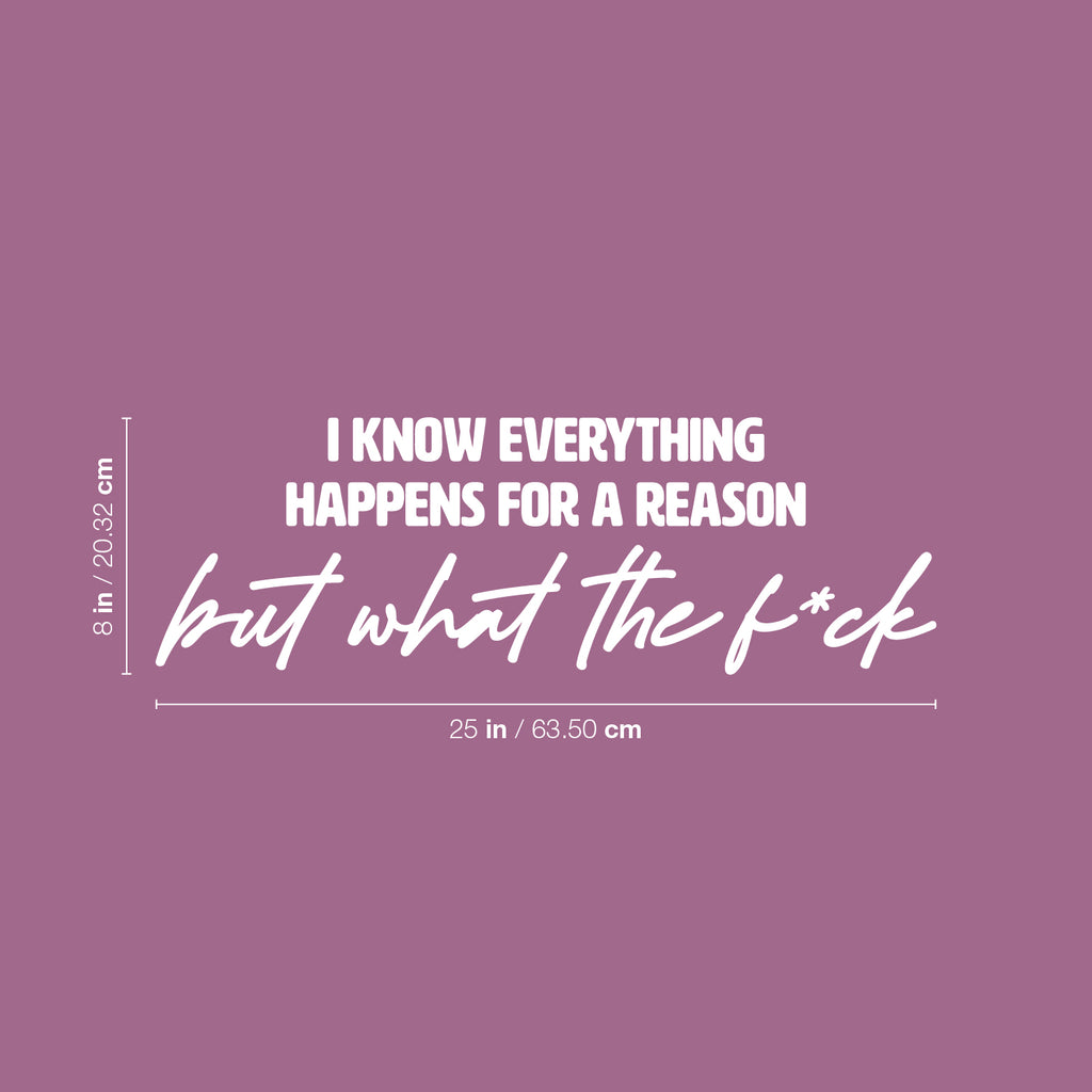 This awesome funny & sarcastic decal quote "I Know Everything Happens For A Reason But What The F*ck"; is the perfect touch for your home or office. Use it for your business; coffee shop; bathroom or anywhere you want to bring some extra inspirational decoration. It's a vinyl sticker that is easy to put on any smooth and dry surface. Our modern designs don't just brighten up the room; but brighten up the day. Using top of the line vinyl across all of our production allows us to be the leaders in quality and design.