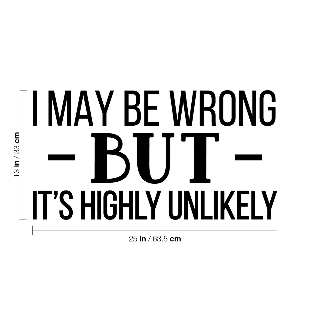 This awesome funny & sarcastic decal quote "I May Be Wrong But Its Highly Unlikely"; is the perfect touch for your home or office. Use it for your store; coffee shop or anywhere you want to bring some extra fun decoration. It's a vinyl sticker that is easy to put on any smooth and dry surface. Our modern designs don't just brighten up the room; but brighten up the day. Using top of the line vinyl across all of our production allows us to be the leaders in quality and design.