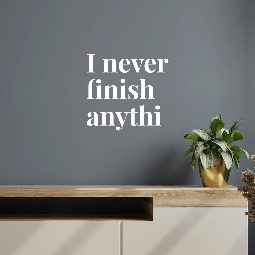 This trendy positive decal quote "I Never Finish Anythi"; is the perfect touch for your home or office. Use it for your living room; boutique; beauty saloon or anywhere you want to bring some extra positive decoration. It's a vinyl sticker that is easy to put on any smooth and dry surface. Our modern designs don't just brighten up the room; but brighten up the day. Using top of the line vinyl across all of our production allows us to be the leaders in quality and design.
