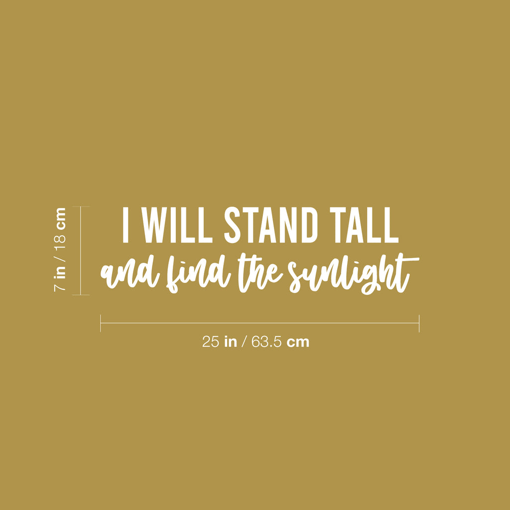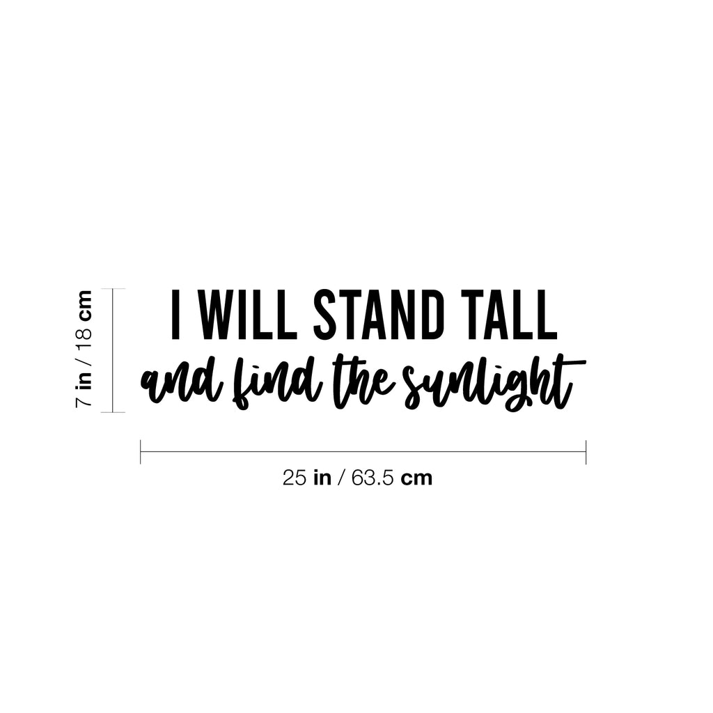 This awesome motivational & positive decal quote "I Will Stand Tall And Find The Sunlight"; is the perfect touch for your home or office. Use it for your bedroom; closet; classroom or anywhere you want to bring some extra positive decoration. It's a vinyl sticker that is easy to put on any smooth and dry surface. Our modern designs don't just brighten up the room; but brighten up the day. Using top of the line vinyl across all of our production allows us to be the leaders in quality and design.