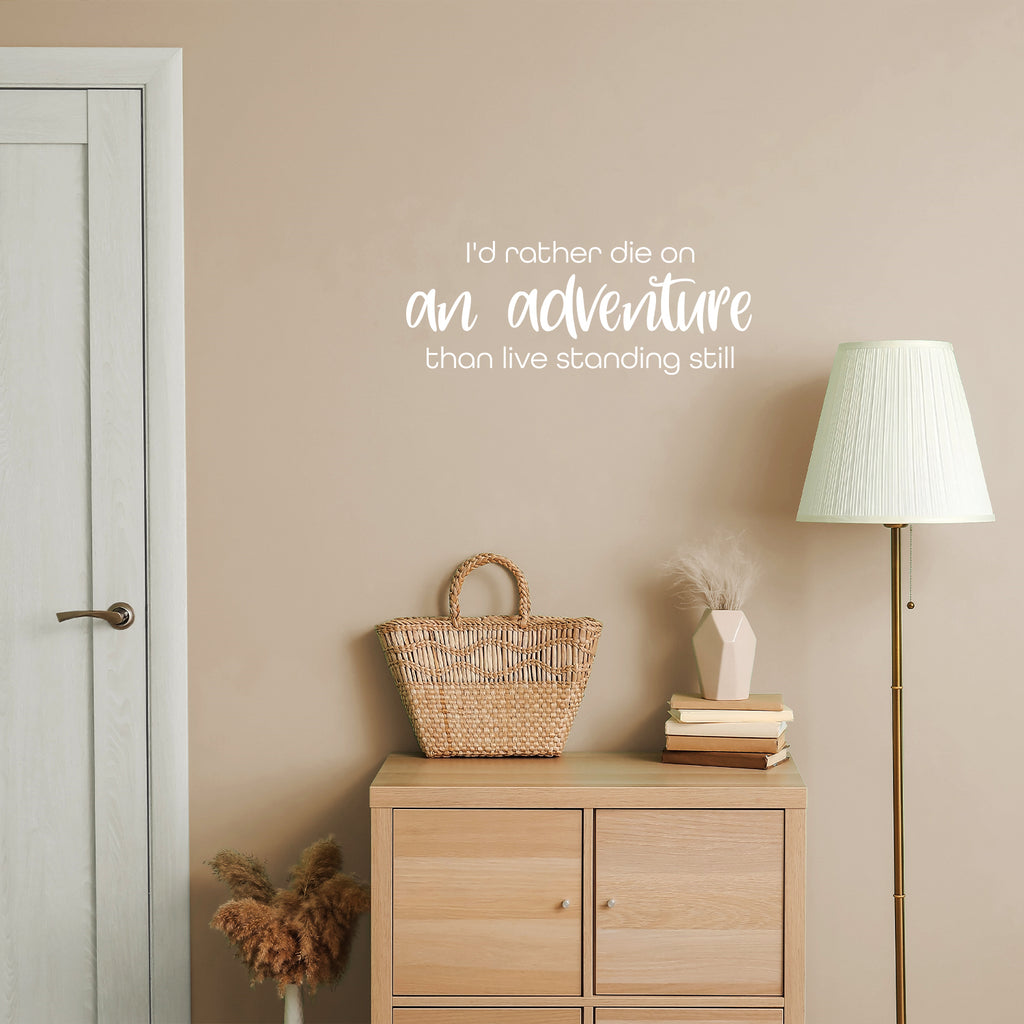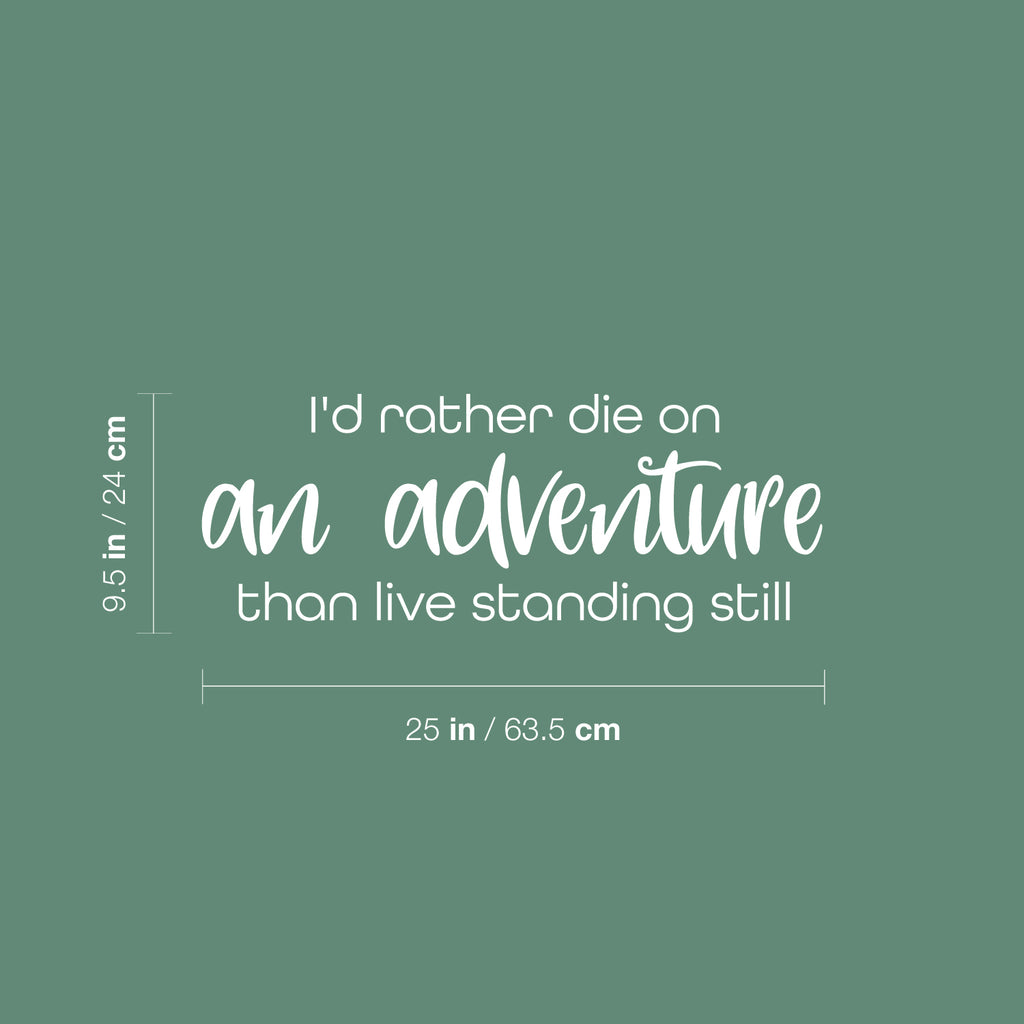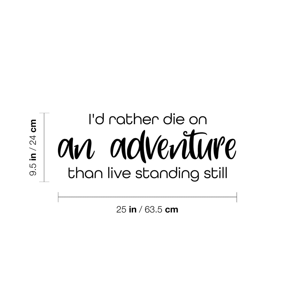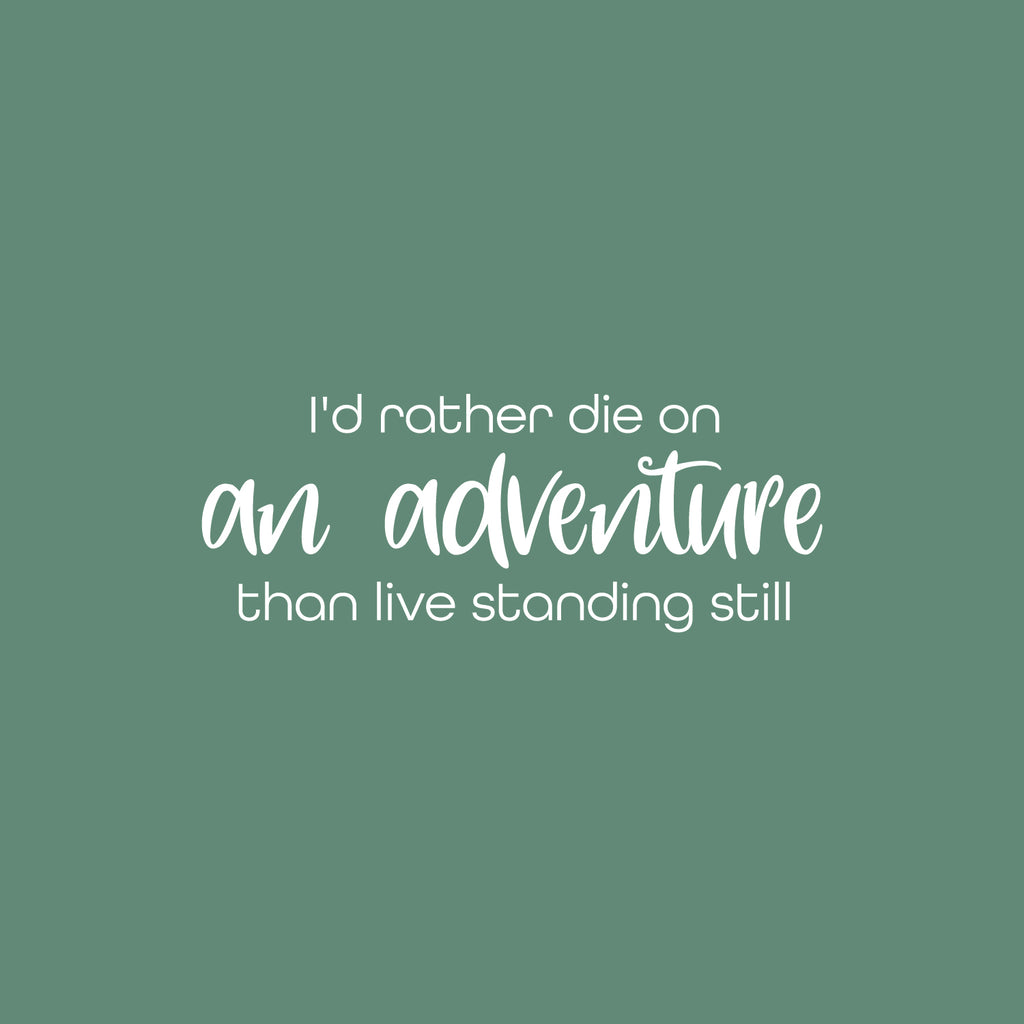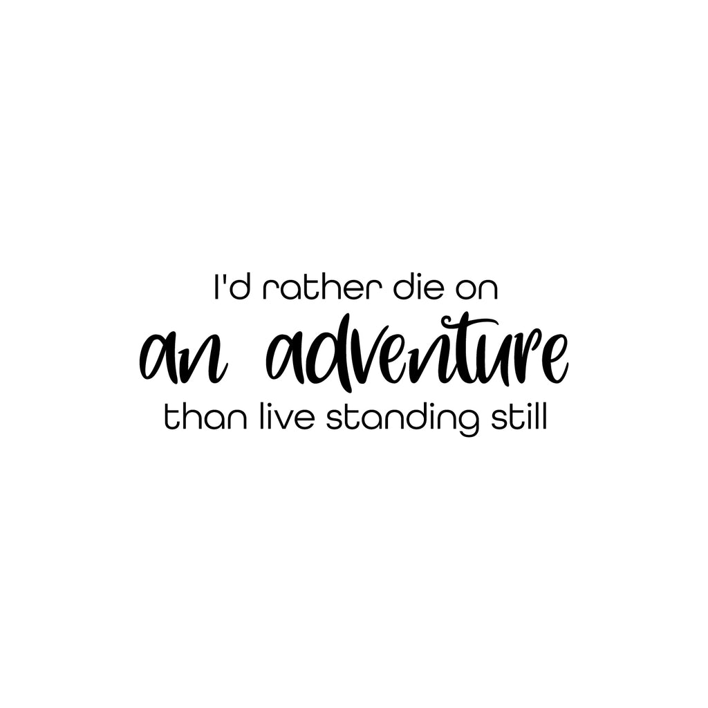 This awesome decal quote "I'd Rather Die On An Adventure Than Live Standing Still"; is the perfect touch for your home. Use it for your living room; apartment or anywhere you want to bring some extra decoration. It's a vinyl sticker that is easy to put on any smooth and dry surface. Our modern designs don't just brighten up the room; but brighten up the day. Using top of the line vinyl across all of our production allows us to be the leaders in quality and design.
