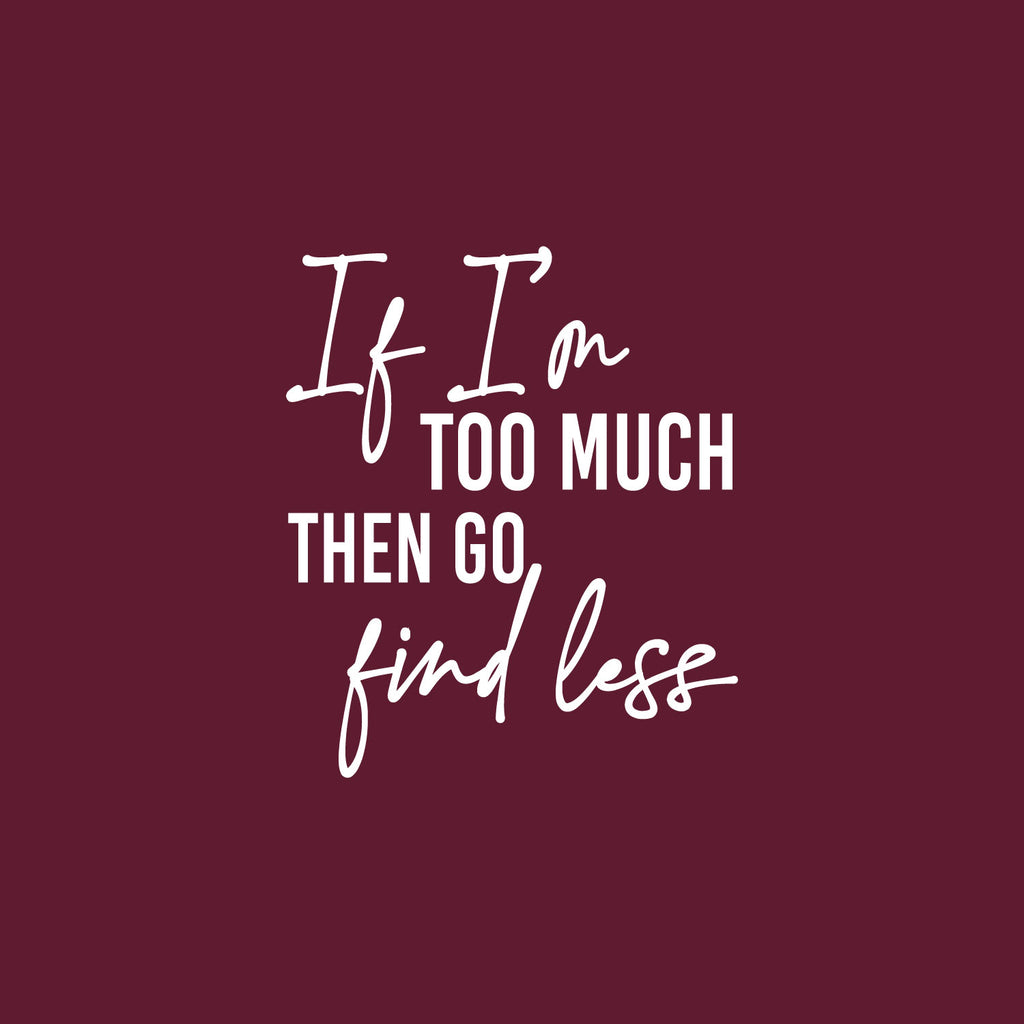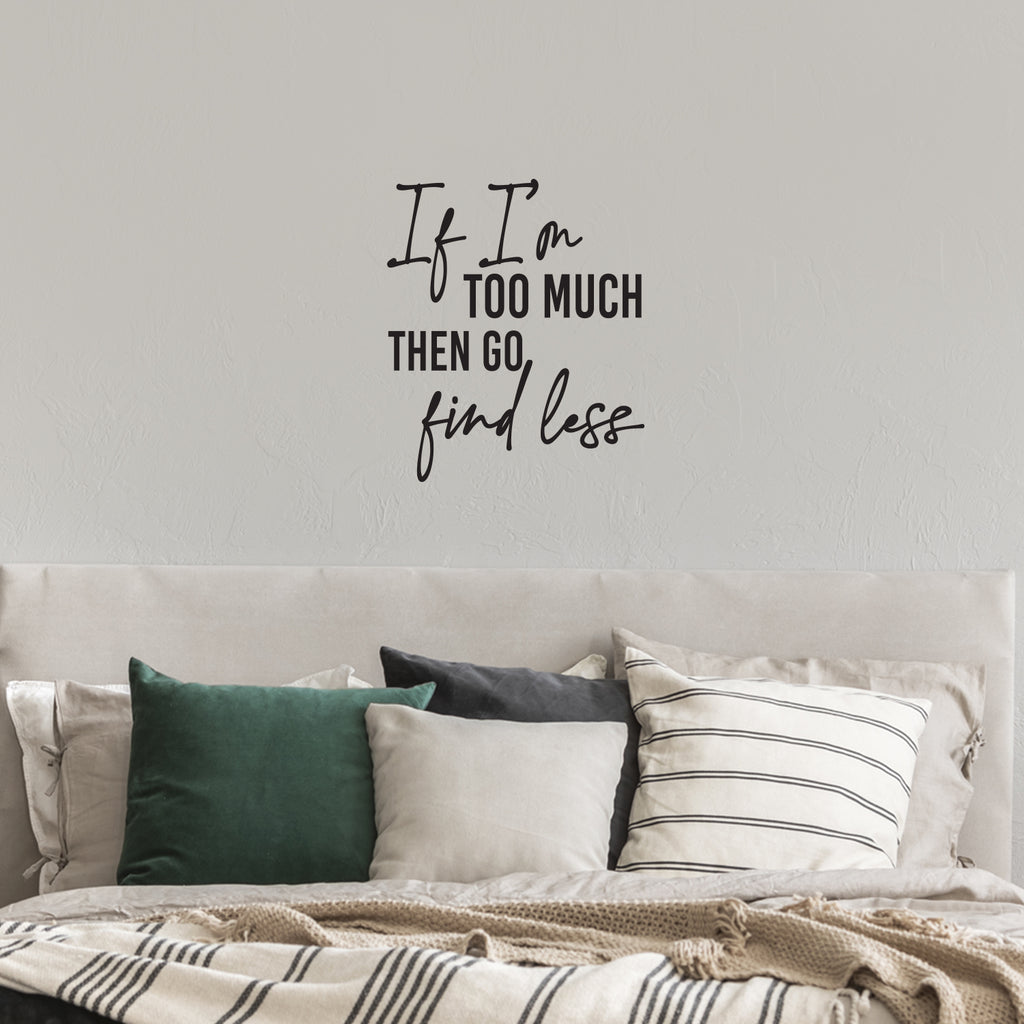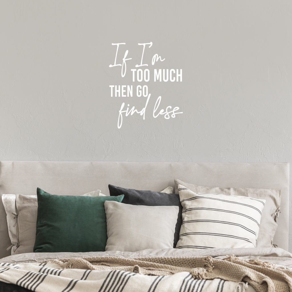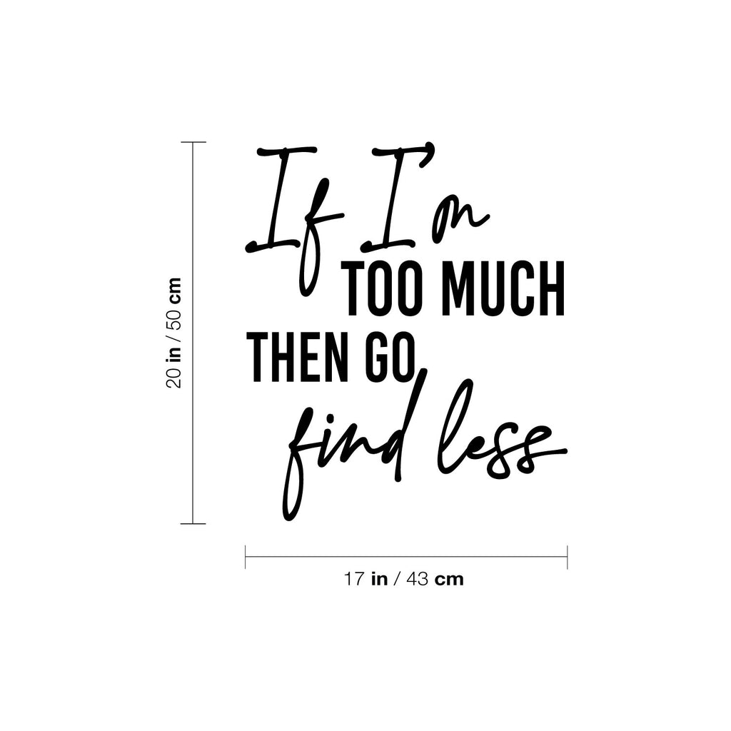 This cute & inspirational decal quote "If I'm Too Much Then Go Find Less"; is the perfect touch for your home. Use it for your living room; office ; coffee shop ; office or anywhere you want to bring some extra cute decoration. It's a vinyl sticker that is easy to put on any smooth and dry surface. Our modern designs don't just brighten up the room; but brighten up the day. Using top of the line vinyl across all of our production allows us to be the leaders in quality and design.