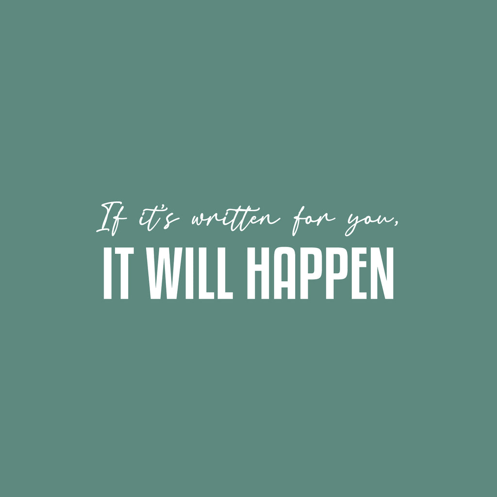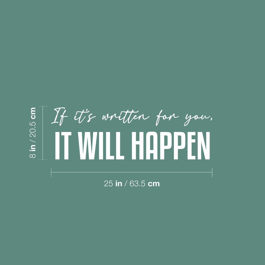 This awesome motivational decal quote "If It's Written For You It Will Happen"; is the perfect touch for your home or school. Use it for your living room; classroom; office or anywhere you want to bring some extra cute decoration. It's a vinyl sticker that is easy to put on any smooth and dry surface. Our modern designs don't just brighten up the room; but brighten up the day. Using top of the line vinyl across all of our production allows us to be the leaders in quality and design.