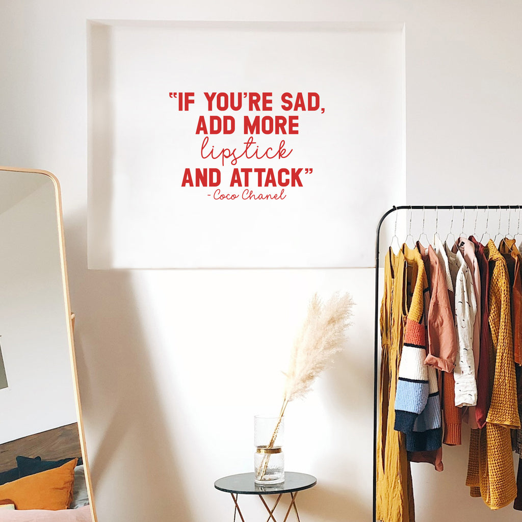 This awesome fun decal quote "If You're Sad Add More Lipstick And Attack - Coco Chanel"; is the perfect touch for your home. Use it for your dorm room; living room; bathroom or anywhere you want to bring some extra fun decoration. It's a vinyl sticker that is easy to put on any smooth and dry surface. Our modern designs don't just brighten up the room; but brighten up the day. Using top of the line vinyl across all of our production allows us to be the leaders in quality and design.