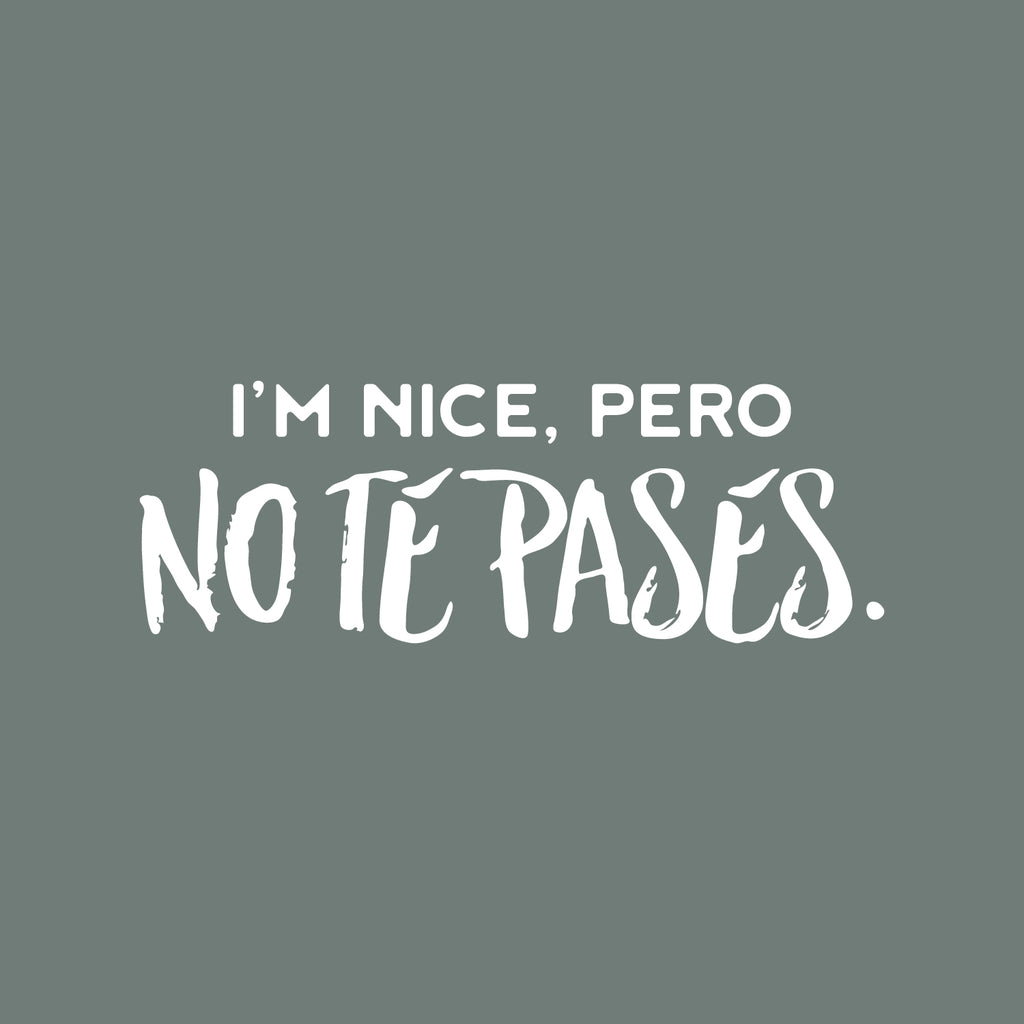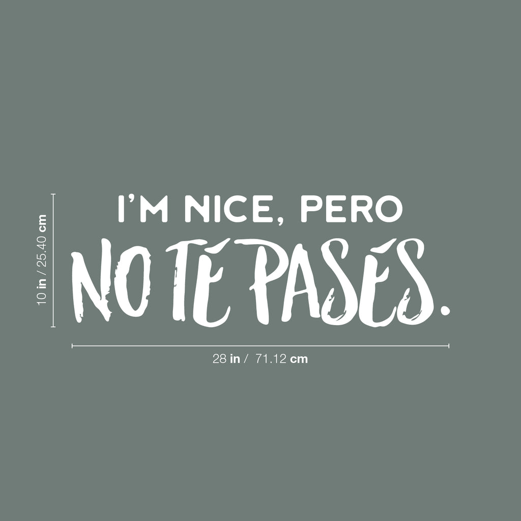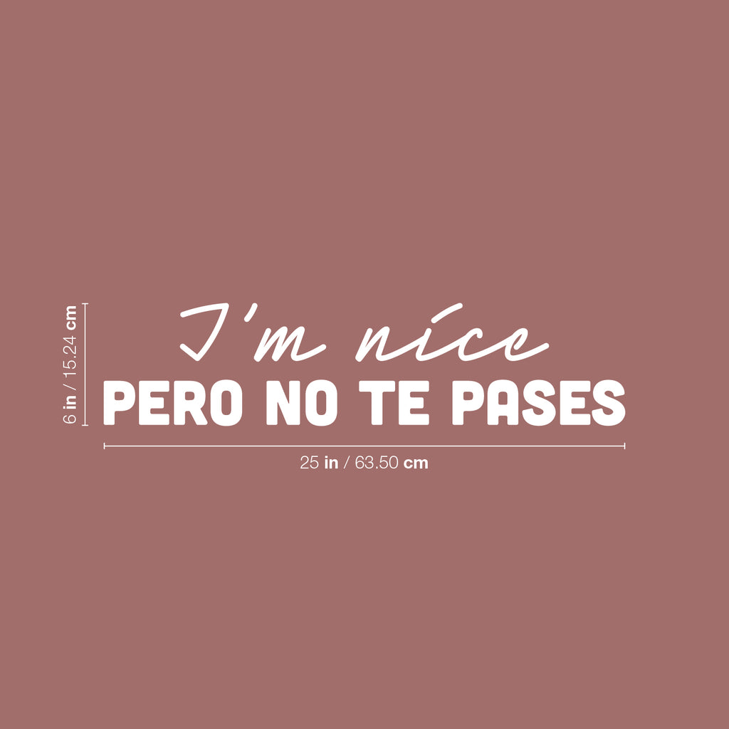 This awesome funny decal quote "I'm Nice Pero No Te Pases"; is the perfect touch for your home or storefront. Use it for your kitchen; restaurant or anywhere you want to bring some extra fun decoration. It's a vinyl sticker that is easy to put on any smooth and dry surface. Our modern designs don't just brighten up the room; but brighten up the day. Using top of the line vinyl across all of our production allows us to be the leaders in quality and design.