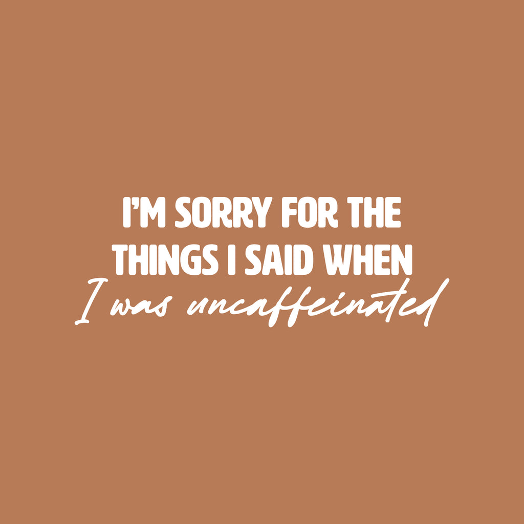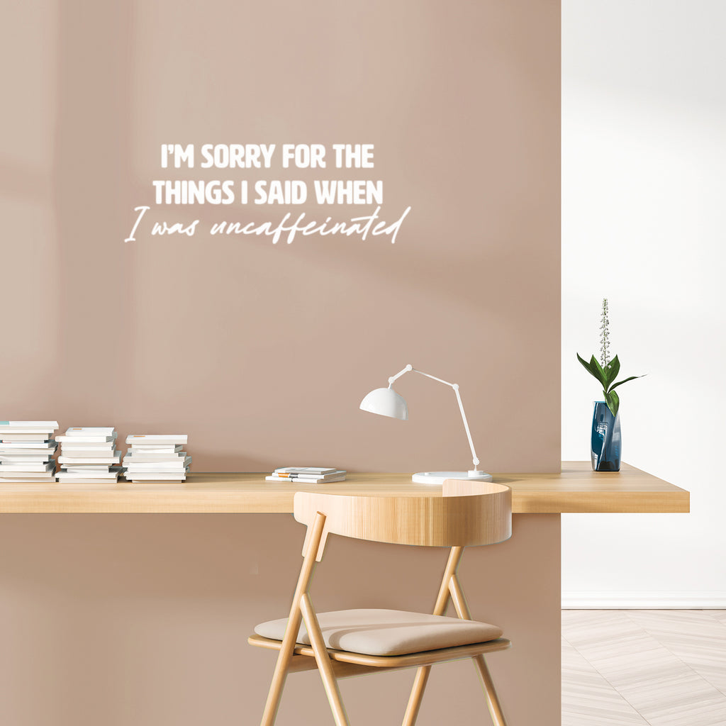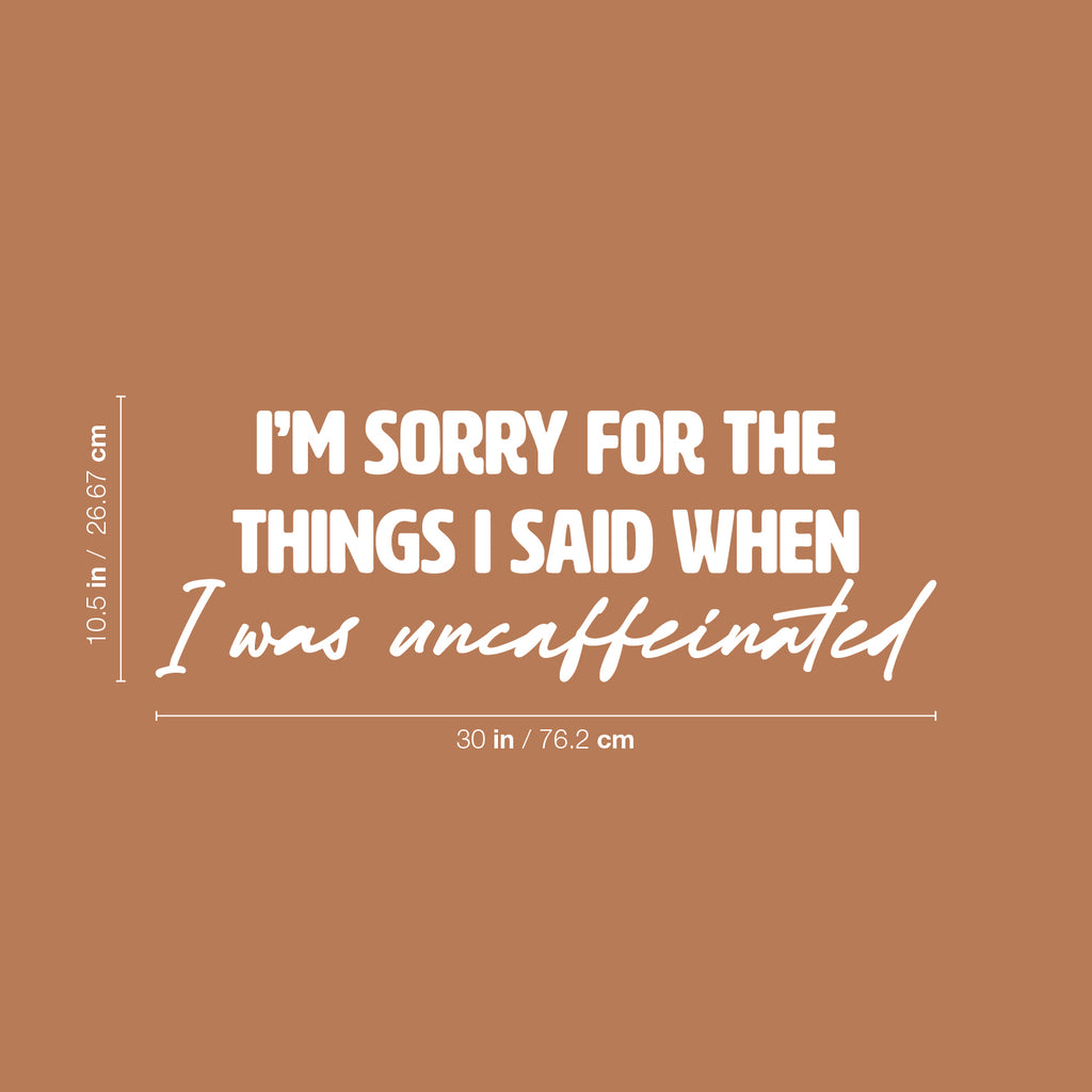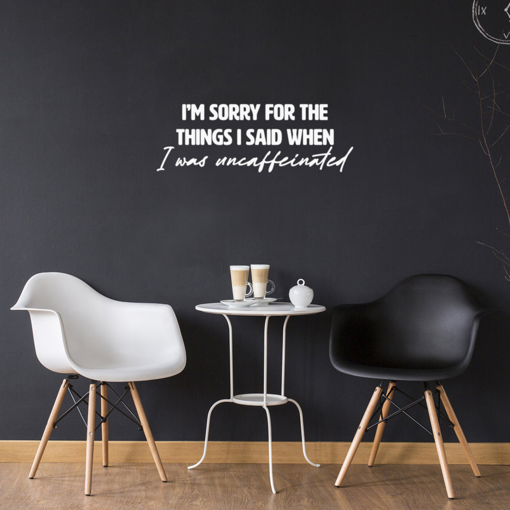 This awesome decal quote "I'm Sorry For The Things I Said When I Was Uncaffeinated"; is the perfect touch for your home. Use it for your kitchen; living room; office kitchenette or anywhere you want to bring some extra decoration. It's a vinyl sticker that is easy to put on any smooth and dry surface. Our modern designs don't just brighten up the room; but brighten up the day. Using top of the line vinyl across all of our production allows us to be the leaders in quality and design.