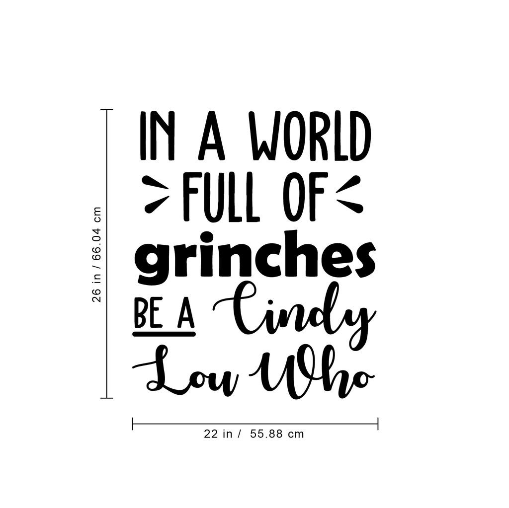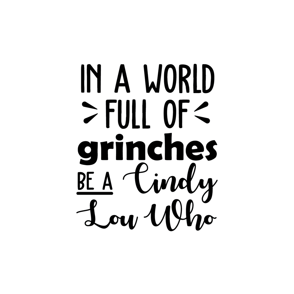 This Christmas decal quote "In A World Full Of Grinches Be a Cindy Lou Who" is the perfect touch for your home or store. Use it for your living room; kitchen; at a bar; or anywhere you want to bring some extra decoration. It's a vinyl sticker that is easy to put on any smooth and dry surface. Our modern designs don't just brighten up the room; but brighten up the day. Using top of the line vinyl across all of our production allows us to be the leaders in quality and design.