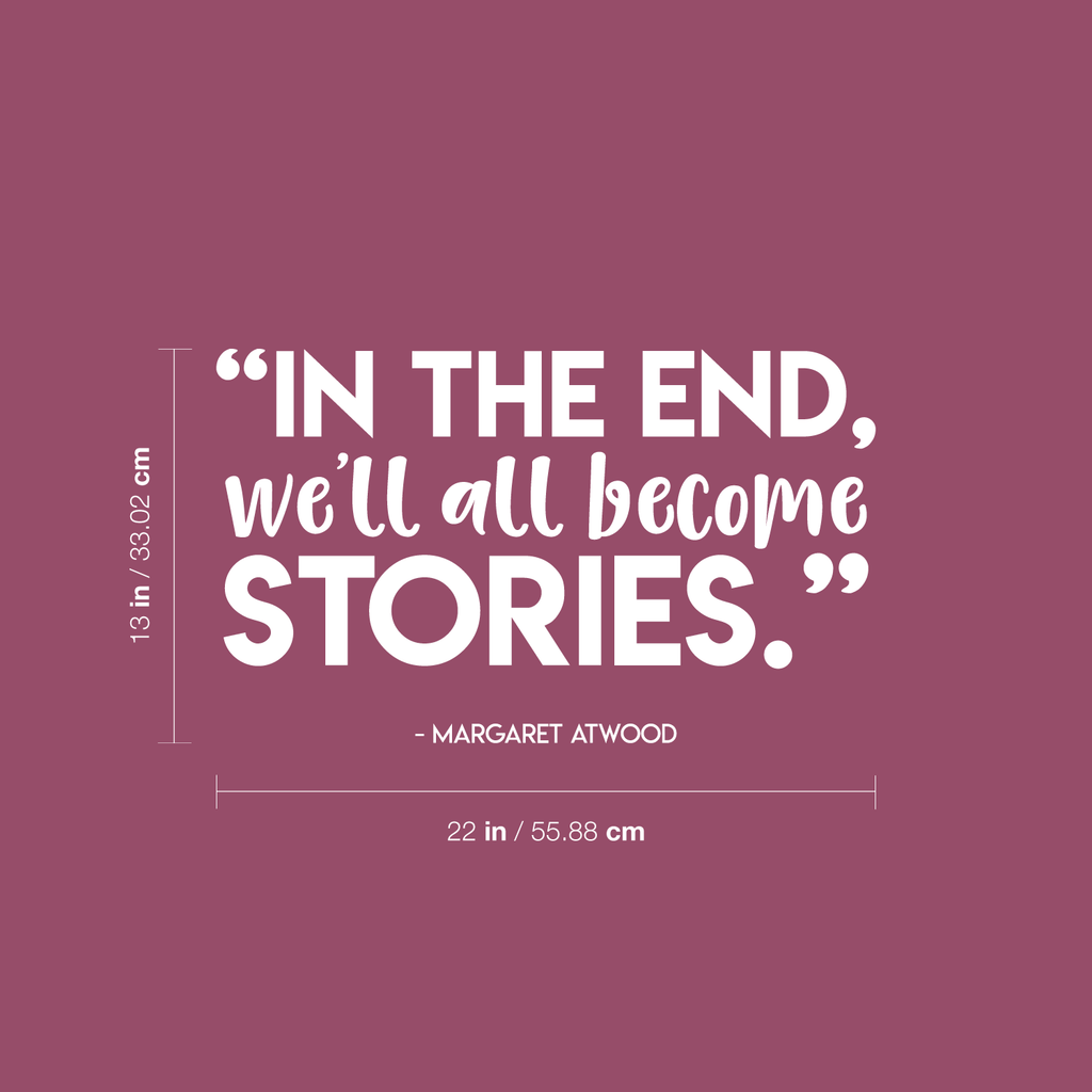 This awesome decal quote "In The End We'll All Become Stories - Margaret Atwood"; is the perfect touch for your home or apartment. Use it for your bedroom; living room; office; or anywhere you want to bring some extra decoration. It's a vinyl sticker that is easy to put on any smooth and dry surface. Our modern designs don't just brighten up the room; but brighten up the day. Using top of the line vinyl across all of our production allows us to be the leaders in quality and design.
