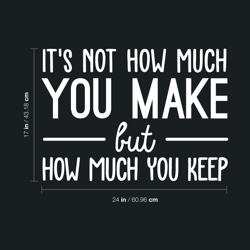 This awesome positive decal quote "It's Not How Much You Make But How Much You Keep"; is the perfect touch for your home or office. Use it for your bedroom; playroom; living room or anywhere you want to bring some extra positive decoration. It's a vinyl sticker that is easy to put on any smooth and dry surface. Our modern designs don't just brighten up the room; but brighten up the day. Using top of the line vinyl across all of our production allows us to be the leaders in quality and design.