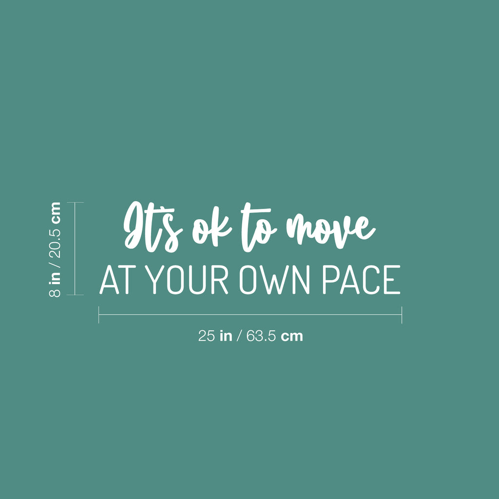 This modern positive & motivational decal quote "It's Ok To Move At Your Own Pace"; is the perfect touch for your fitness center or home gym. Use it for your office; yoga classes; studio dance or anywhere you want to bring some extra positive decoration. It's a vinyl sticker that is easy to put on any smooth and dry surface. Our modern designs don't just brighten up the room; but brighten up the day. Using top of the line vinyl across all of our production allows us to be the leaders in quality and design.