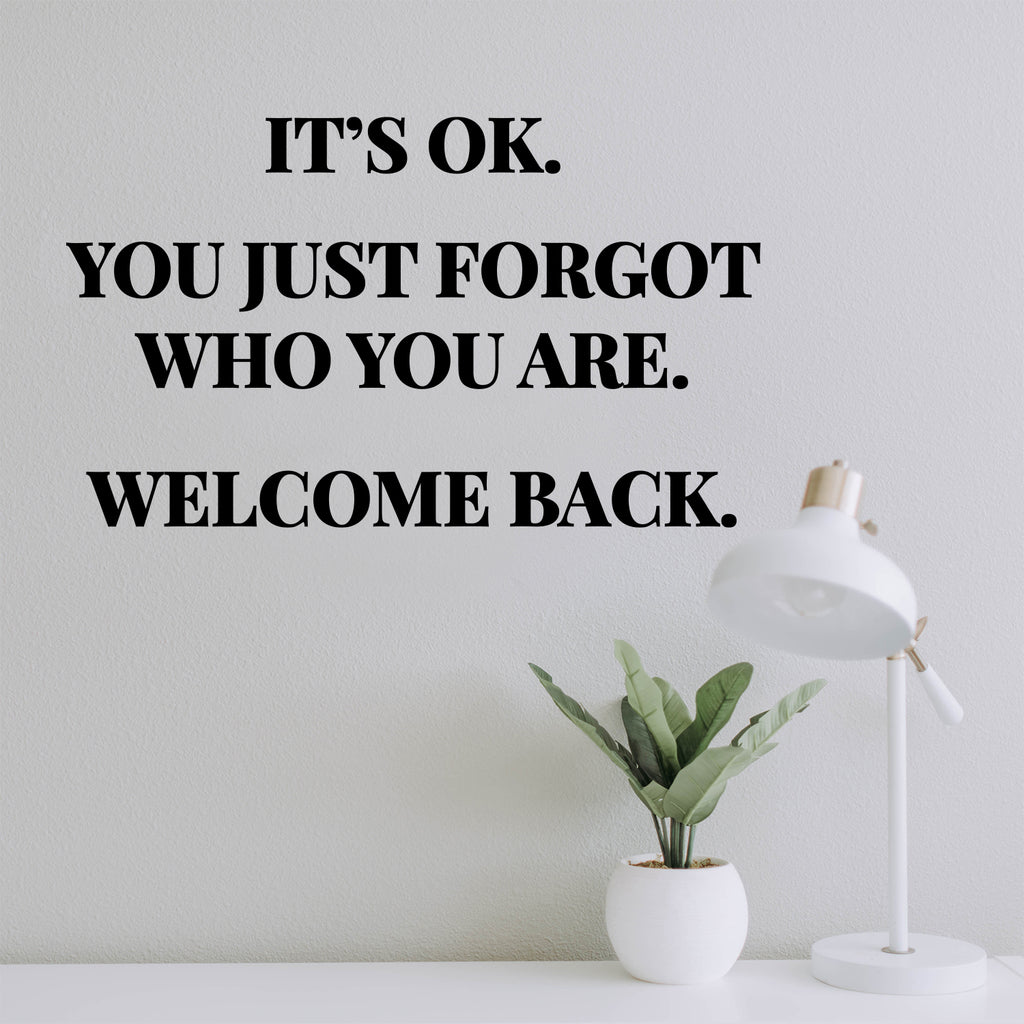 This awesome lovely decal quote "It's Ok You Just Forgot Who You Are Welcome Back"; is the perfect touch for your home. Use it for your bedroom; living room; closet or anywhere you want to bring some extra positive decoration. It's a vinyl sticker that is easy to put on any smooth and dry surface. Our modern designs don't just brighten up the room; but brighten up the day. Using top of the line vinyl across all of our production allows us to be the leaders in quality and design.