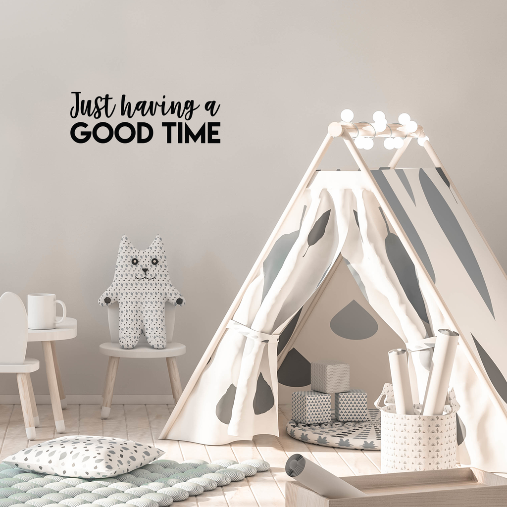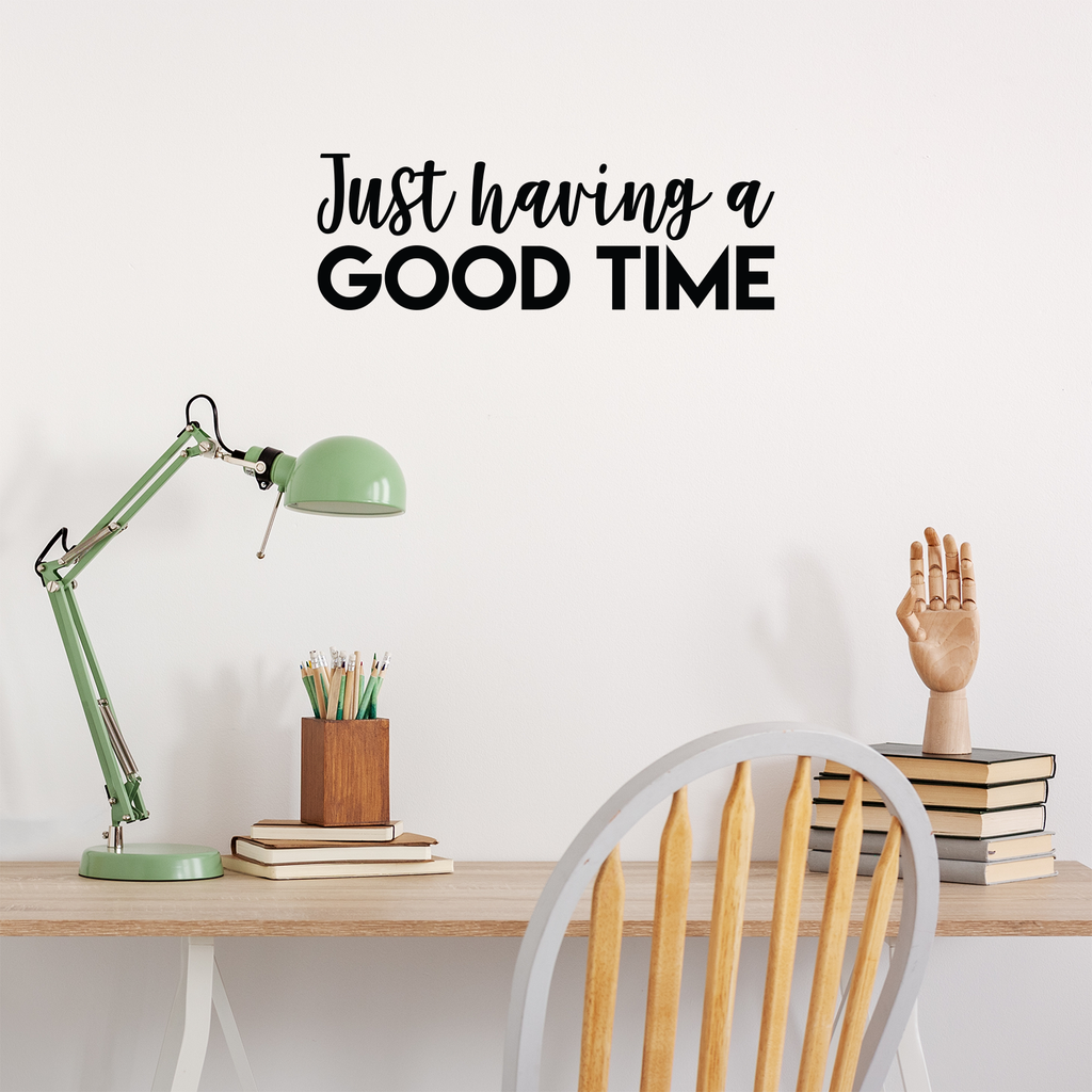 This awesome decal quote "Just Having A Good Time"; is the perfect touch for your home or apartment. Use it for your bedroom; kids room; home office or anywhere you want to bring some extra decoration. It's a vinyl sticker that is easy to put on any smooth and dry surface. Our modern designs don't just brighten up the room; but brighten up the day. Using top of the line vinyl across all of our production allows us to be the leaders in quality and design.