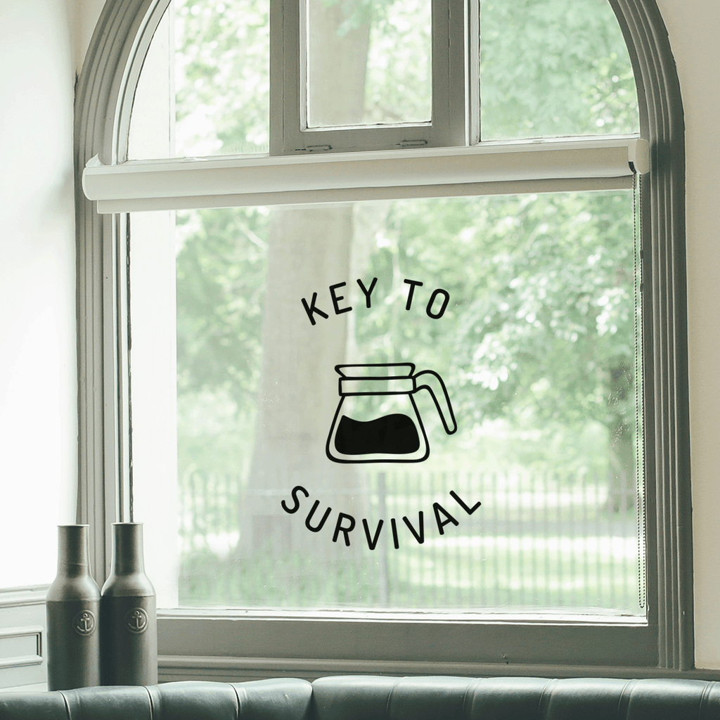 This awesome decal quote "Key To Survival"; is the perfect touch for coffee lover's home or workplace. Use it for your living room; office; or anywhere you want to bring some extra decoration. It's a vinyl sticker that is easy to put on any smooth and dry surface. Our modern designs don't just brighten up the room; but brighten up the day. Using top of the line vinyl across all of our production allows us to be the leaders in quality and design.