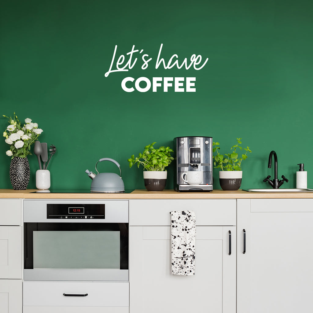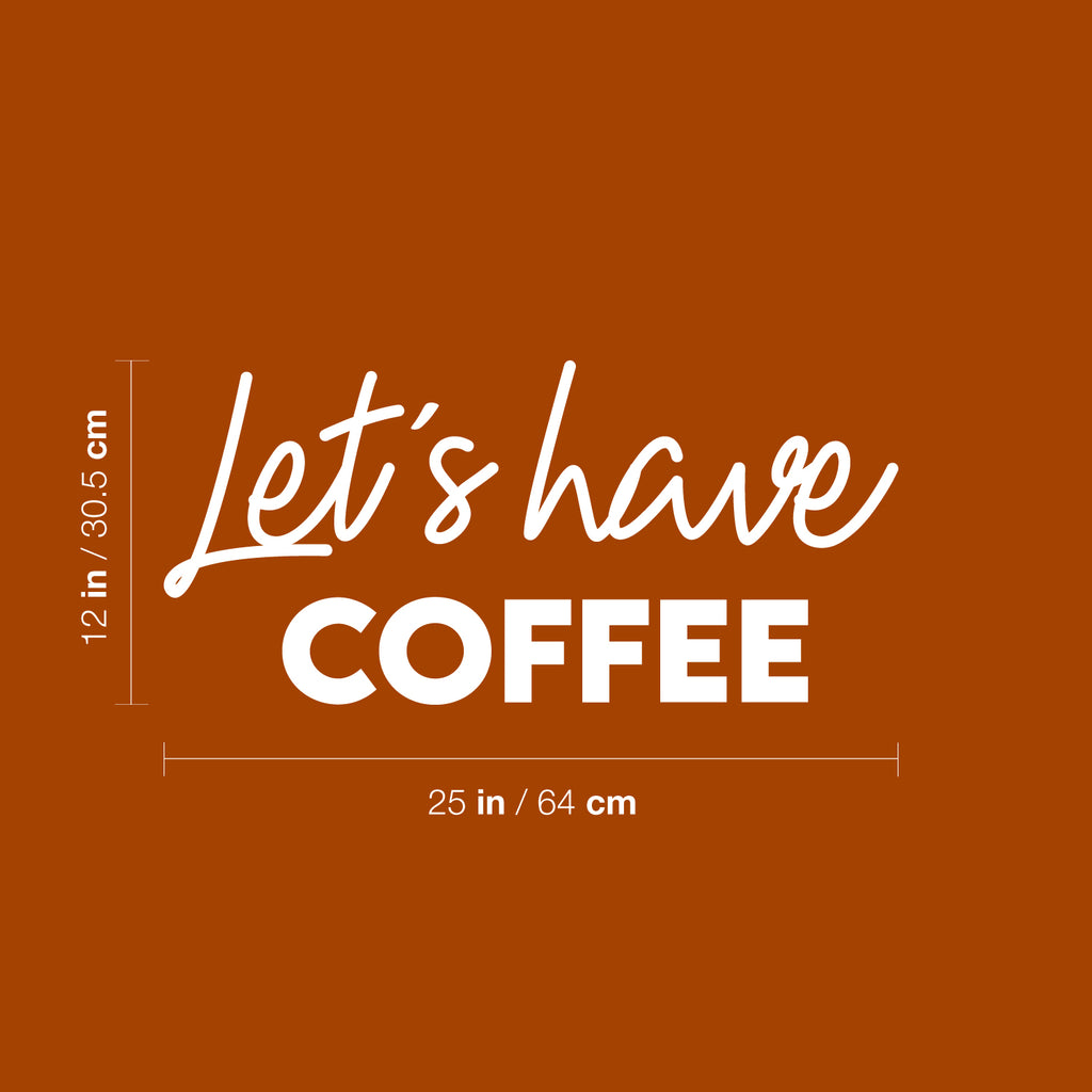This awesome fun decal quote "Let's Have Coffee"; is the perfect touch for your office or coffee shop. Use it for your dining room; restaurant; kitchen or anywhere you want to bring some extra fun decoration. It's a vinyl sticker that is easy to put on any smooth and dry surface. Our modern designs don't just brighten up the room; but brighten up the day. Using top of the line vinyl across all of our production allows us to be the leaders in quality and design.