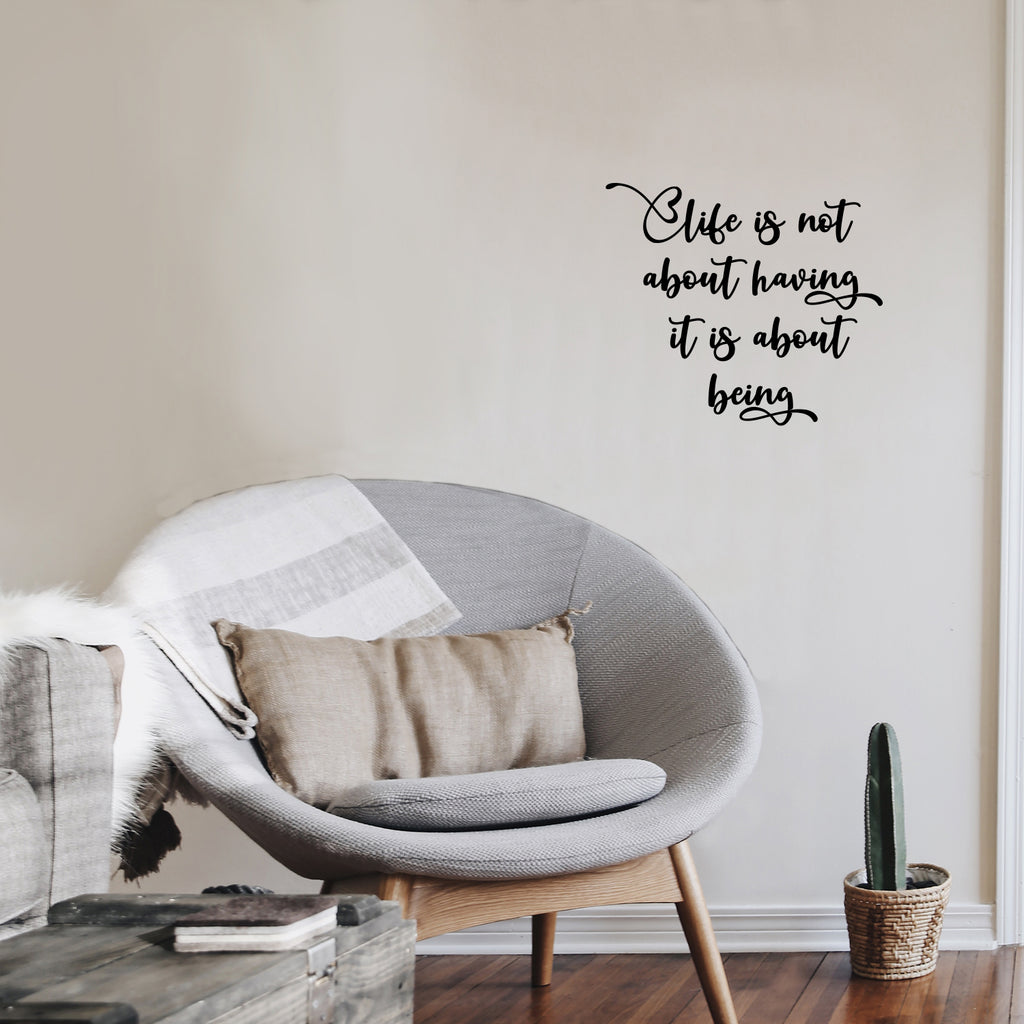 This awesome inspirational decal quote "Life Is Not About Having It Is About Being"; is the perfect touch for your school. Use it for your classroom; playroom or anywhere you want to bring some extra inspirational decoration. It's a vinyl sticker that is easy to put on any smooth and dry surface. Our modern designs don't just brighten up the room; but brighten up the day. Using top of the line vinyl across all of our production allows us to be the leaders in quality and design.