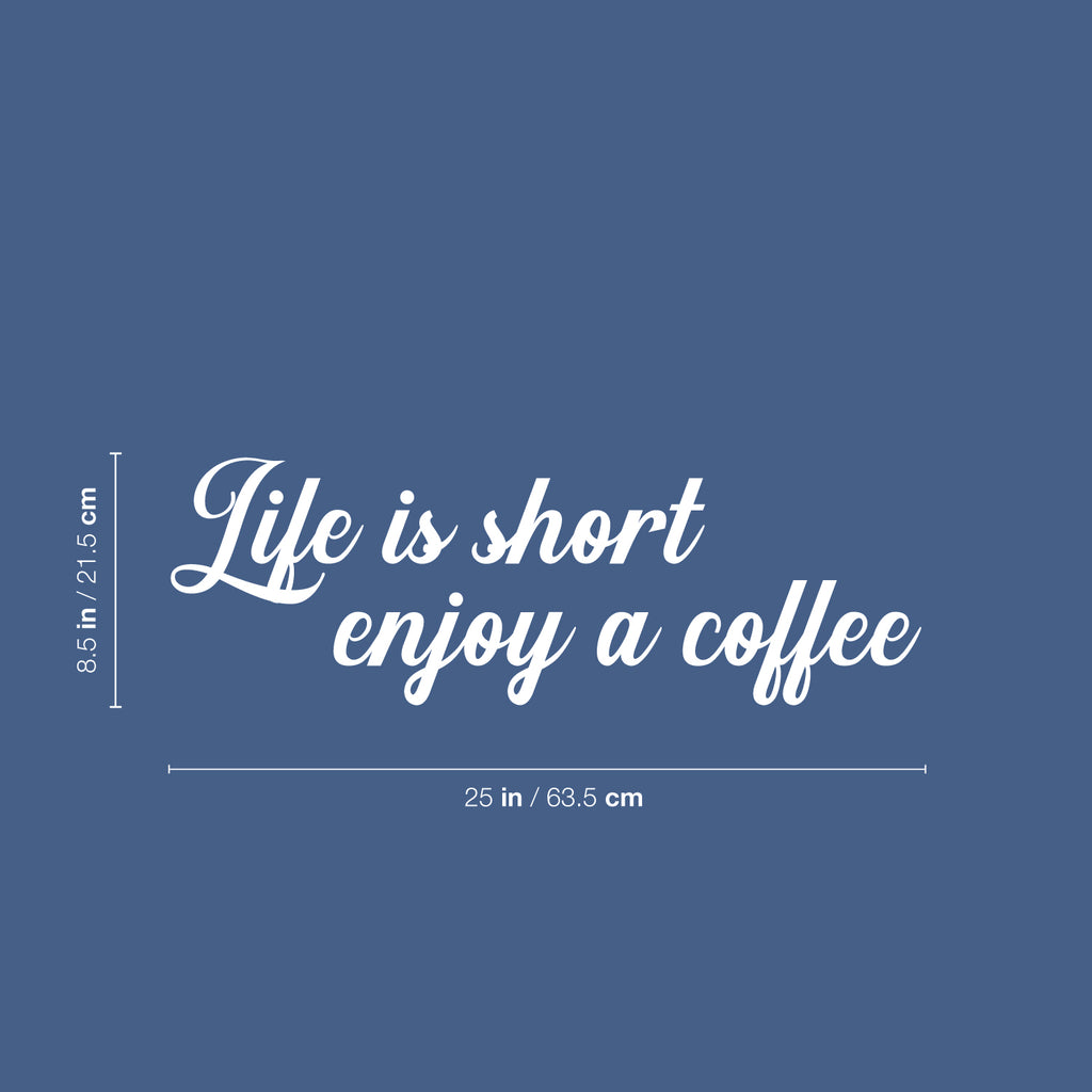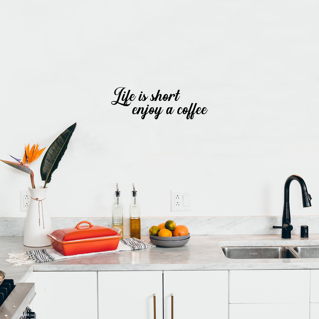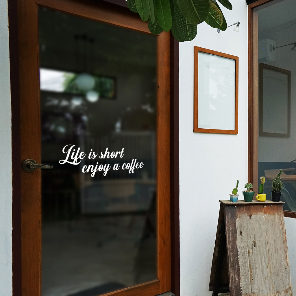 This awesome funny & inspiring decal quote "Life Is Short Enjoy A Coffee"; is the perfect touch for your office or coffee shop. Use it for your dining room; restaurant; kitchen or anywhere you want to bring some extra fun decoration. It's a vinyl sticker that is easy to put on any smooth and dry surface. Our modern designs don't just brighten up the room; but brighten up the day. Using top of the line vinyl across all of our production allows us to be the leaders in quality and design.