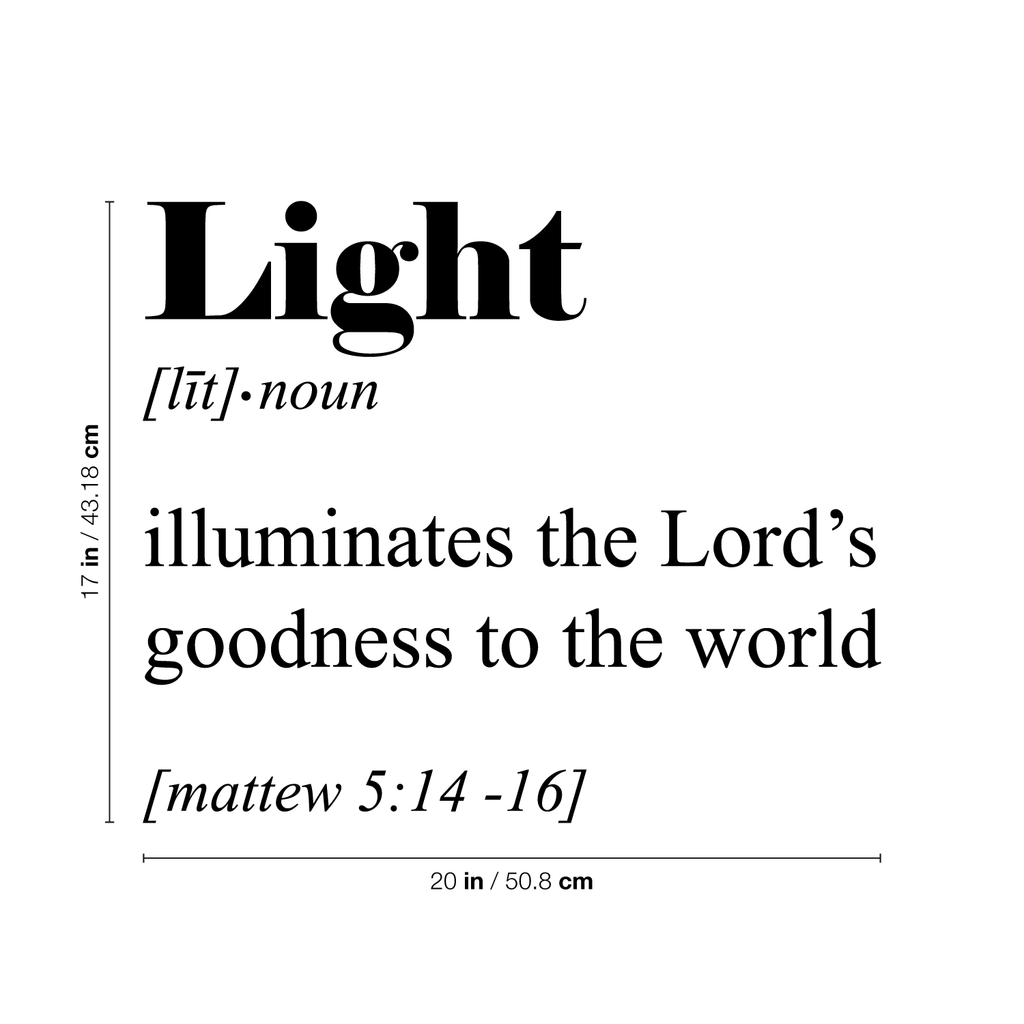 This awesome decal quote "Light Bible Definition - Mattew 5:14-16"; is the perfect touch for your home. Use it for your bedroom; office or anywhere you want to bring some extra religious decoration. It's a vinyl sticker that is easy to put on any smooth and dry surface. Our modern designs don't just brighten up the room; but brighten up the day. Using top of the line vinyl across all of our production allows us to be the leaders in quality and design.