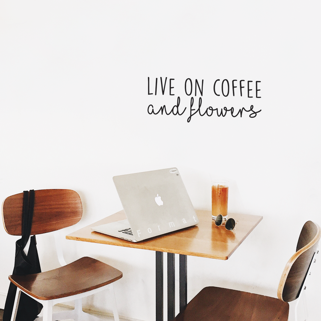 This awesome decal quote "Live On Coffee And Flowers"; is the perfect touch for your home or office. Use it for your kitchen; living room; coffee shop or anywhere you want to bring some extra decoration. It's a vinyl sticker that is easy to put on any smooth and dry surface. Our modern designs don't just brighten up the room; but brighten up the day. Using top of the line vinyl across all of our production allows us to be the leaders in quality and design.