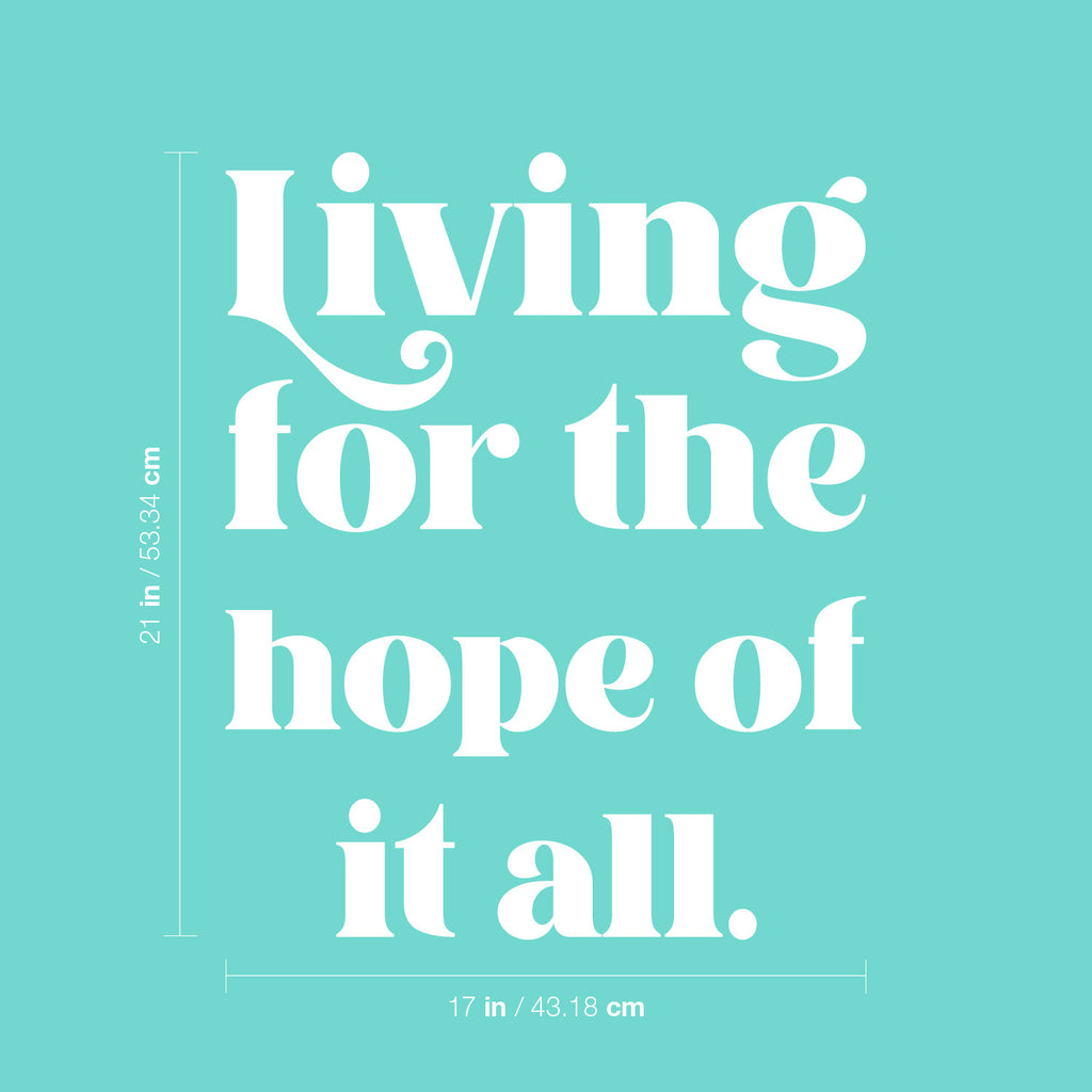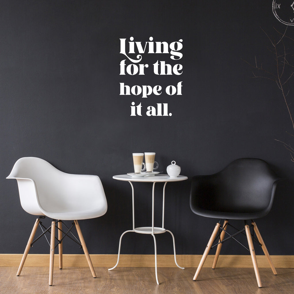 This awesome cute & spiritual decal quote "Living For The Hope Of It All"; is the perfect touch for your home. Use it for your kids room; living room or anywhere you want to bring some extra decoration. It's a vinyl sticker that is easy to put on any smooth and dry surface. Our modern designs don't just brighten up the room; but brighten up the day. Using top of the line vinyl across all of our production allows us to be the leaders in quality and design.