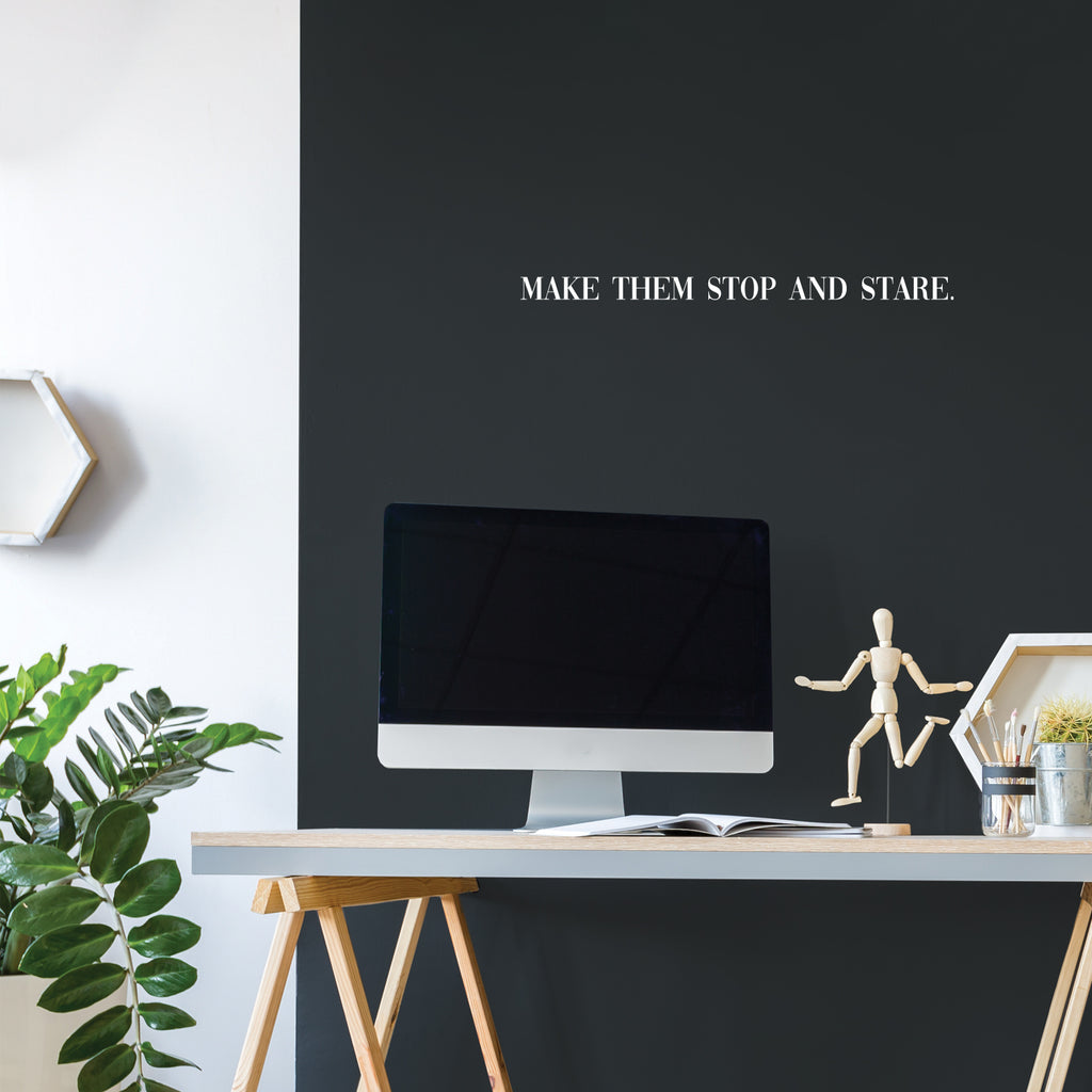 This awesome cute & chic decal quote "Make Them Stop And Stare"; is the perfect touch for your home or office. Use it for your make up mirror; bathroom; closet or anywhere you want to bring some extra positive decoration. It's a vinyl sticker that is easy to put on any smooth and dry surface. Our modern designs don't just brighten up the room; but brighten up the day. Using top of the line vinyl across all of our production allows us to be the leaders in quality and design.