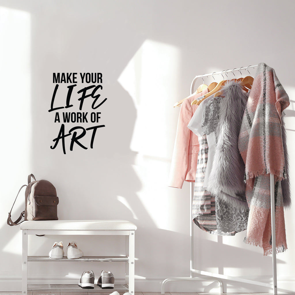 This awesome optimistic decal quote "Make Your Life A Work Of Art"; is the perfect touch for your home or work. Use it for your bedroom; living room or anywhere you want to bring some positive decoration. It's a vinyl sticker that is easy to put on any smooth and dry surface. Our modern designs don't just brighten up the room; but brighten up the day. Using top of the line vinyl across all of our production allows us to be the leaders in quality and design.
