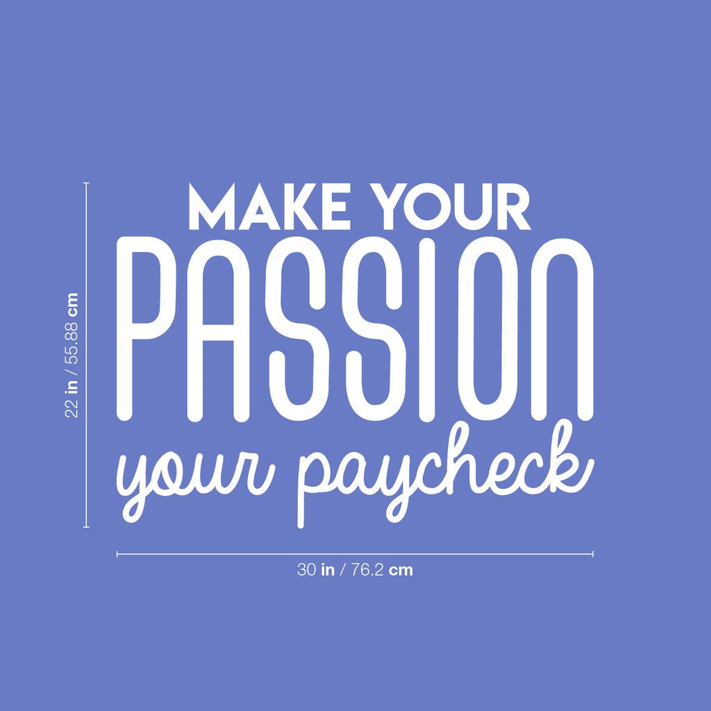 This awesome motivational decal quote "Make Your Passion Your Paycheck"; is the perfect touch for your home or work. Use it for your dorm room; home office; apartment or anywhere you want to bring some extra girly decoration. It's a vinyl sticker that is easy to put on any smooth and dry surface. Our modern designs don't just brighten up the room; but brighten up the day. Using top of the line vinyl across all of our production allows us to be the leaders in quality and design.
