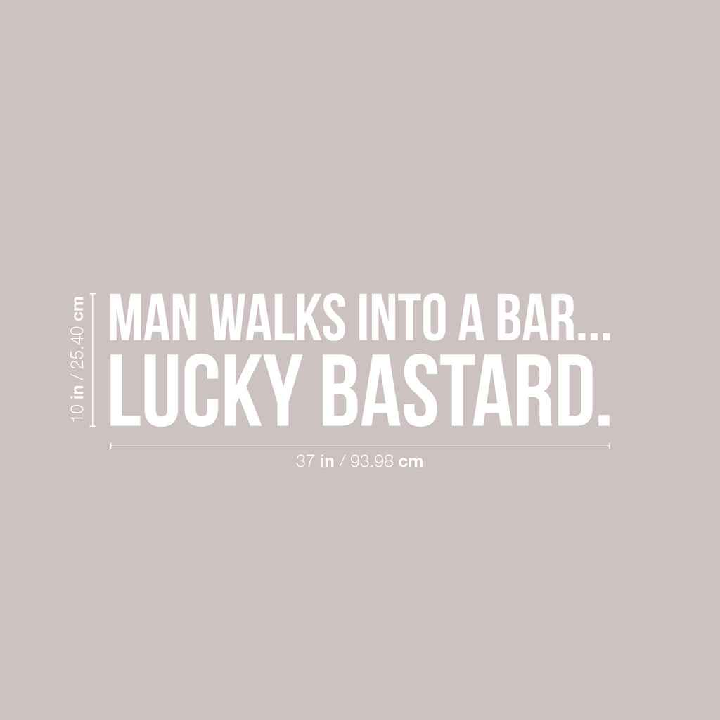 This awesome decal quote "Man Walks Into A Bar ... Lucky Bastard."; is the perfect touch for your store. Use it for your sport bar; mini bar; wine store or anywhere you want to bring some extra decoration. It's a vinyl sticker that is easy to put on any smooth and dry surface. Our modern designs don't just brighten up the room; but brighten up the day. Using top of the line vinyl across all of our production allows us to be the leaders in quality and design.