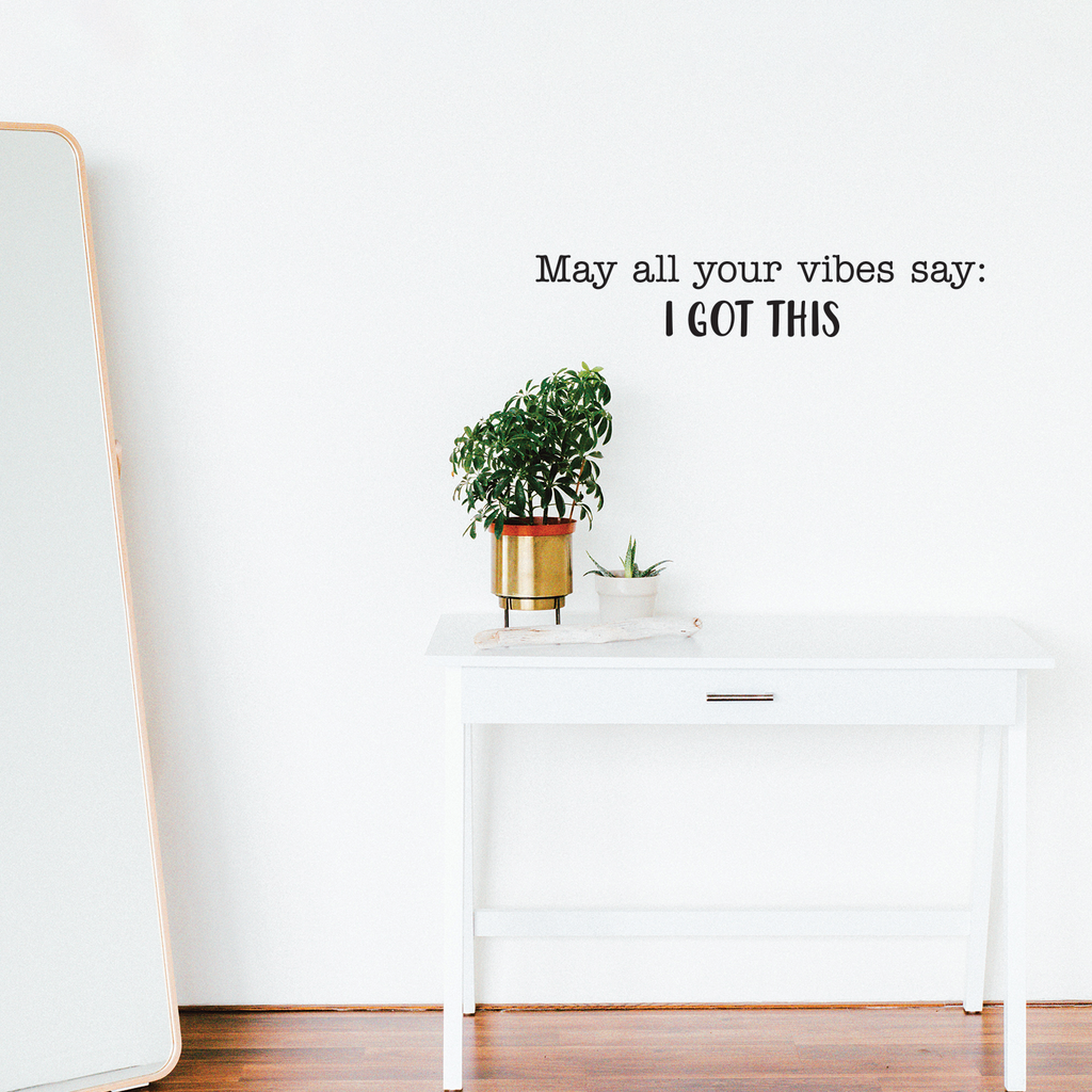 This awesome decal quote "May All Of Your Vibes Say I Got This"; is the perfect touch for your home or workplace. Use it for your bedroom; living room; office or anywhere you want to bring some extra decoration. It's a vinyl sticker that is easy to put on any smooth and dry surface. Our modern designs don't just brighten up the room; but brighten up the day. Using top of the line vinyl across all of our production allows us to be the leaders in quality and design.