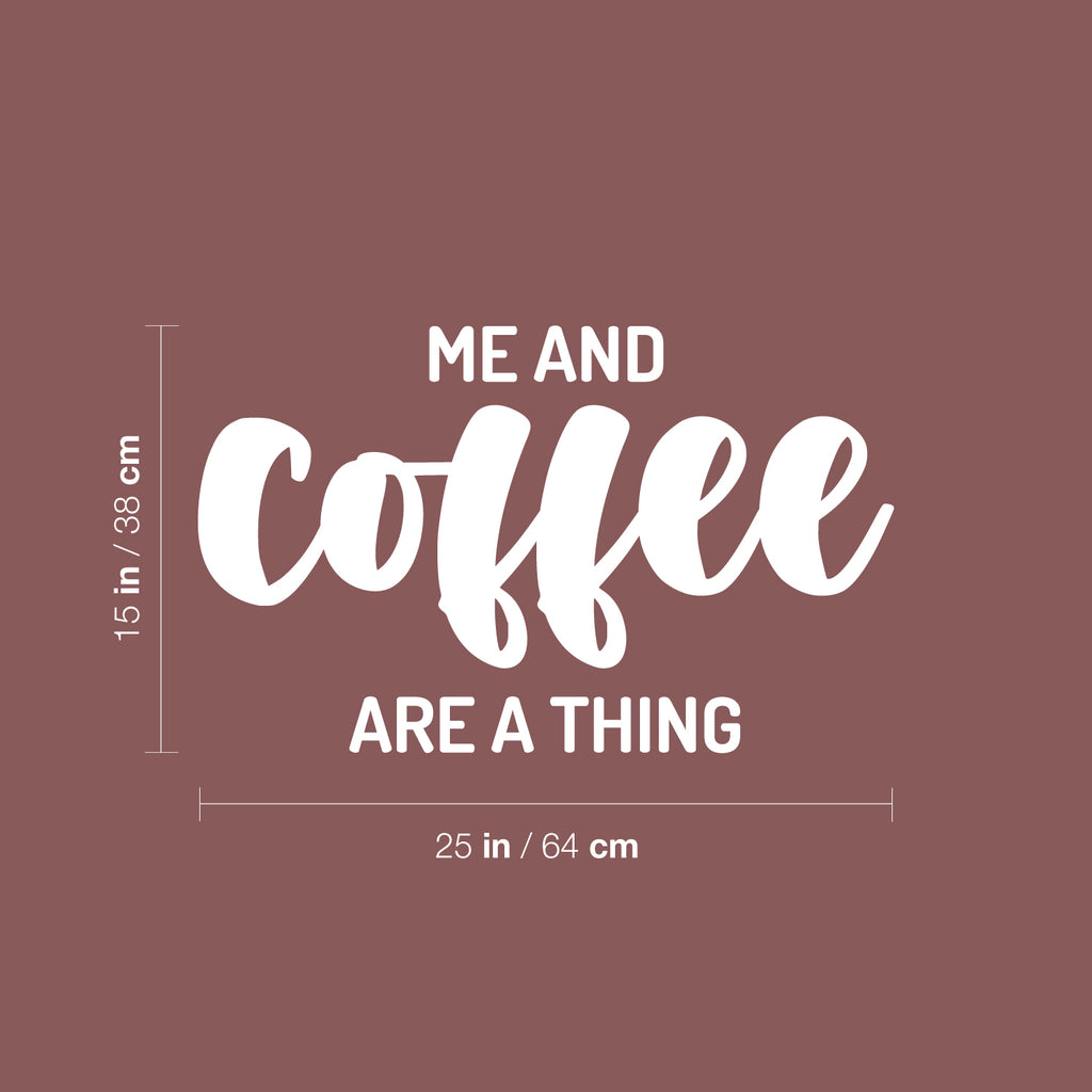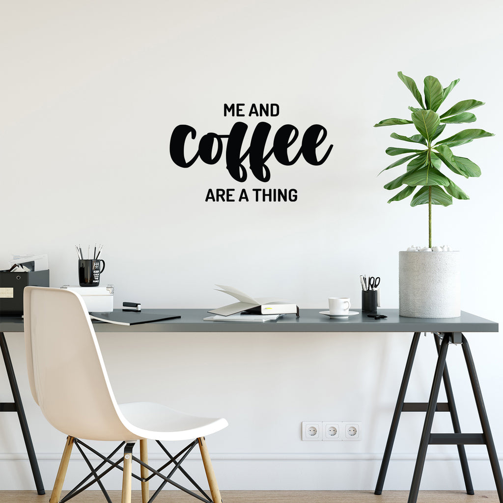This awesome cute & fun decal quote "Me And Coffee Are A Thing"; is the perfect touch for your office or coffee shop. Use it for your dining room; restaurant; kitchen or anywhere you want to bring some extra fun decoration. It's a vinyl sticker that is easy to put on any smooth and dry surface. Our modern designs don't just brighten up the room; but brighten up the day. Using top of the line vinyl across all of our production allows us to be the leaders in quality and design.