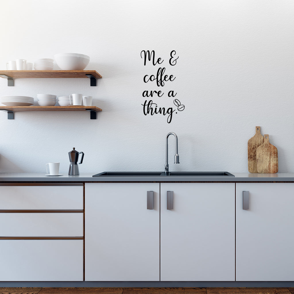 This awesome funny & inspiring decal quote "Me & Coffee Are A Thing"; is the perfect touch for your office or coffee shop. Use it for your dining room; restaurant; kitchen or anywhere you want to bring some extra fun decoration. It's a vinyl sticker that is easy to put on any smooth and dry surface. Our modern designs don't just brighten up the room; but brighten up the day. Using top of the line vinyl across all of our production allows us to be the leaders in quality and design.