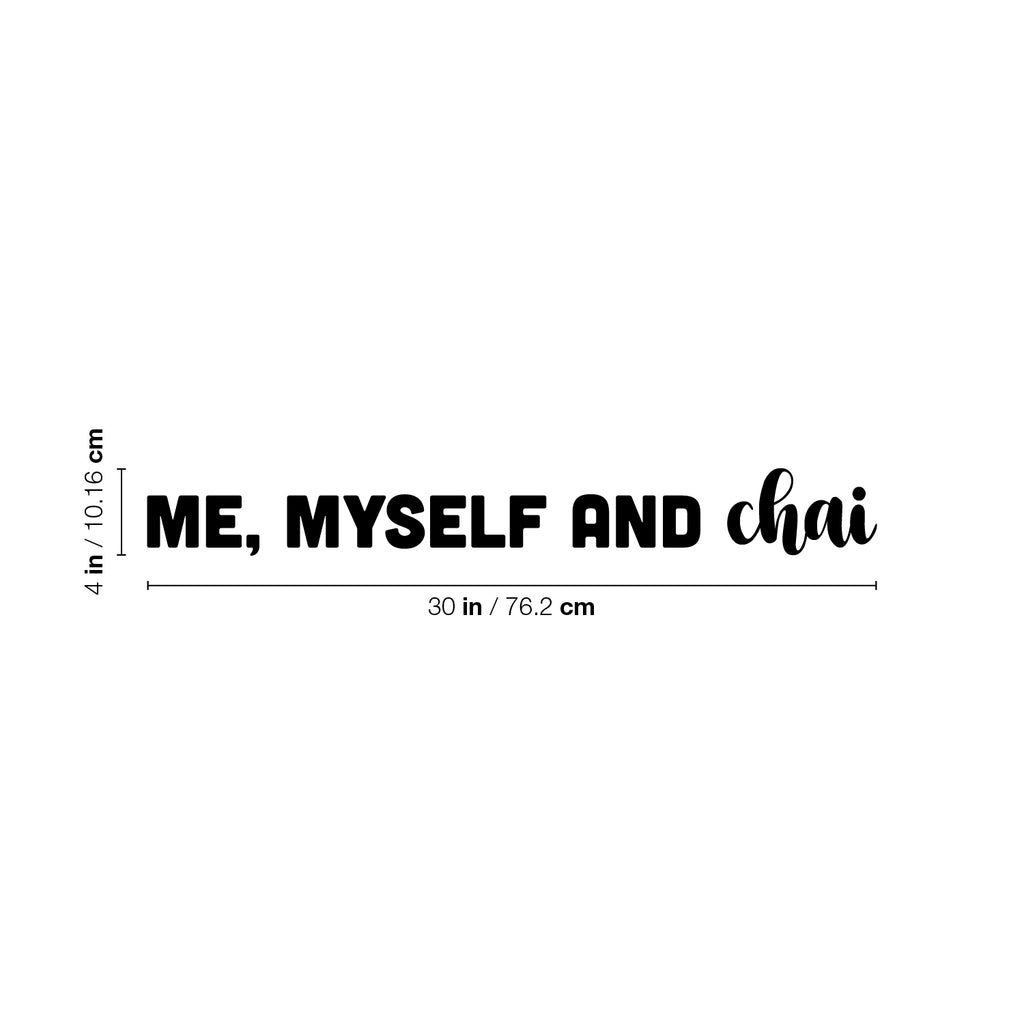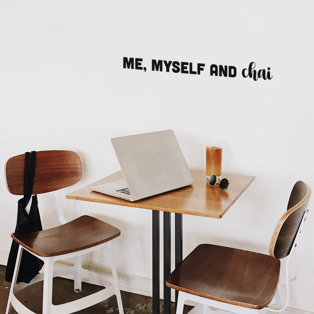 This awesome fun decal quote "Me Myself And Chai"; is the perfect touch for your office or coffee shop. Use it for your dining room; restaurant; kitchen or anywhere yougf want to bring some extra fun decoration. It's a vinyl sticker that is easy to put on any smooth and dry surface. Our modern designs don't just brighten up the room; but brighten up the day. Using top of the line vinyl across all of our production allows us to be the leaders in quality and design.
