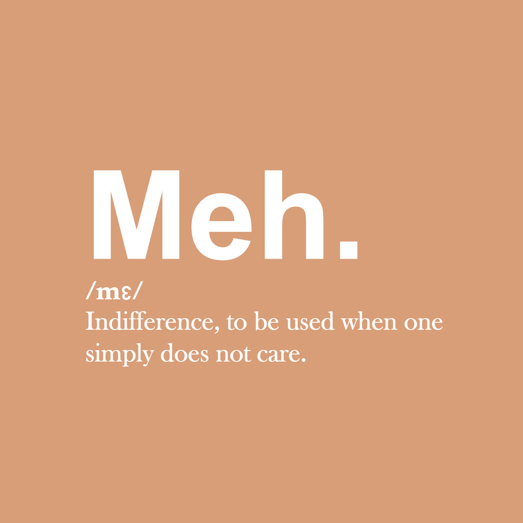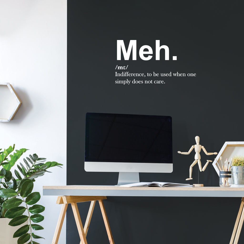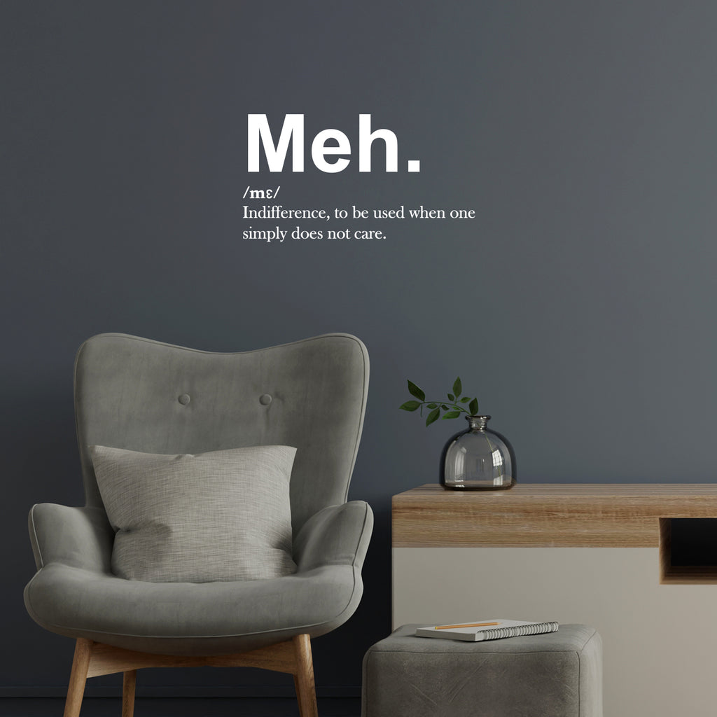 This awesome funny & sarcastic decal quote "Meh. Indifference To Be Used When One Simple Does Not Care"; is the perfect touch for your home or office. Use it for your storefront; coffee shop or anywhere you want to bring some extra sarcastic decoration. It's a vinyl sticker that is easy to put on any smooth and dry surface. Our modern designs don't just brighten up the room; but brighten up the day. Using top of the line vinyl across all of our production allows us to be the leaders in quality and design.