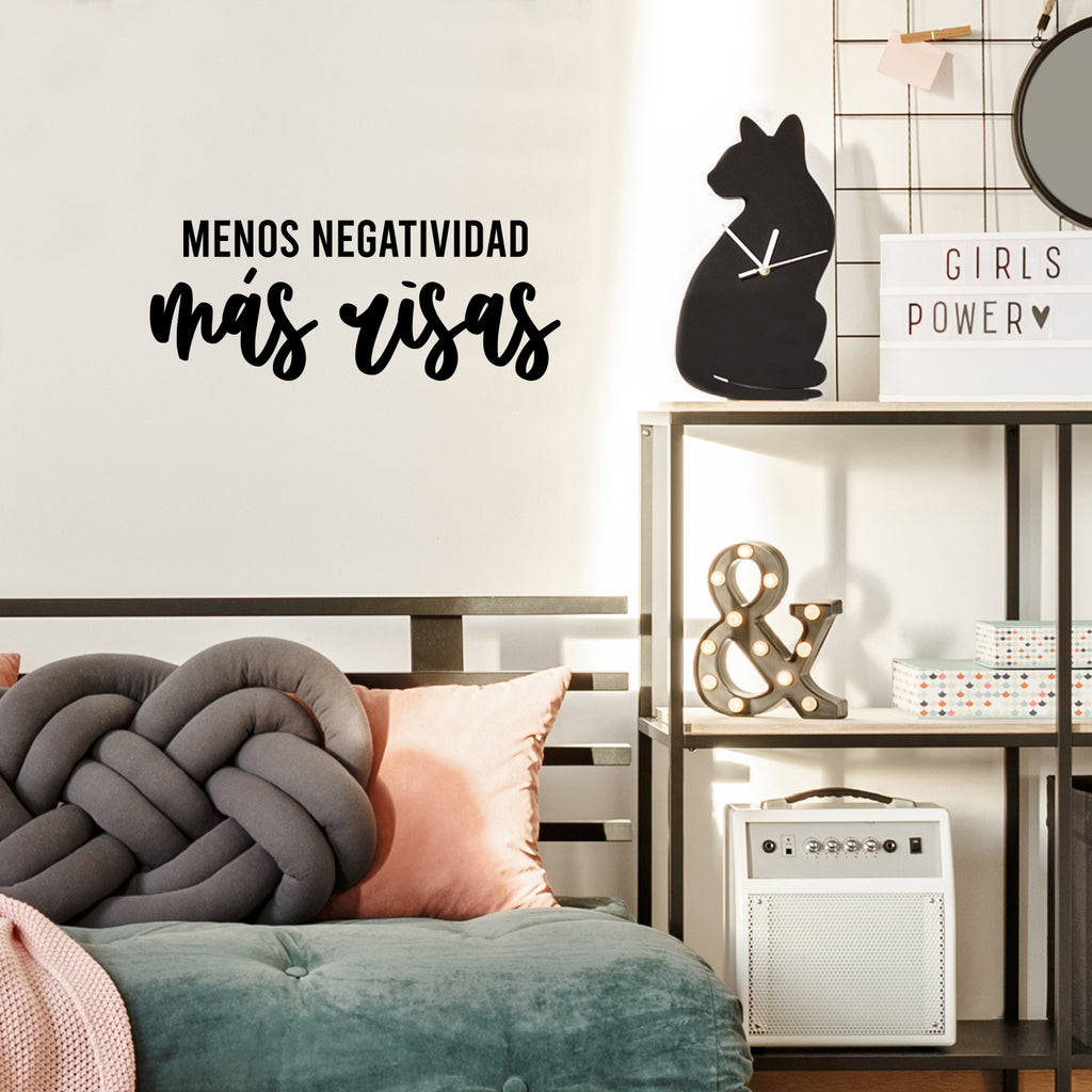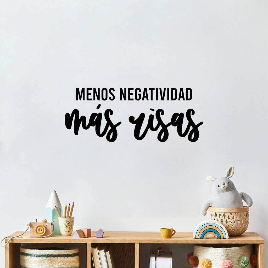 This awesome positive decal quote "Menos Negatividad Más Risas / Less Negativity More Laughs"; is the perfect touch for your home or office. Use it for your school; living room or anywhere you want to bring some extra optimistic decoration. It's a vinyl sticker that is easy to put on any smooth and dry surface. Our modern designs don't just brighten up the room; but brighten up the day. Using top of the line vinyl across all of our production allows us to be the leaders in quality and design.